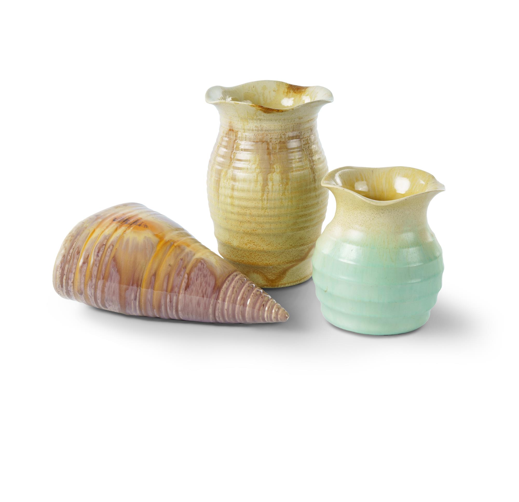 3 Remued Vases A wall pocket, and two ribbed baluster vases with drip glaze. H18.5cm (tallest)Estimate $80-150