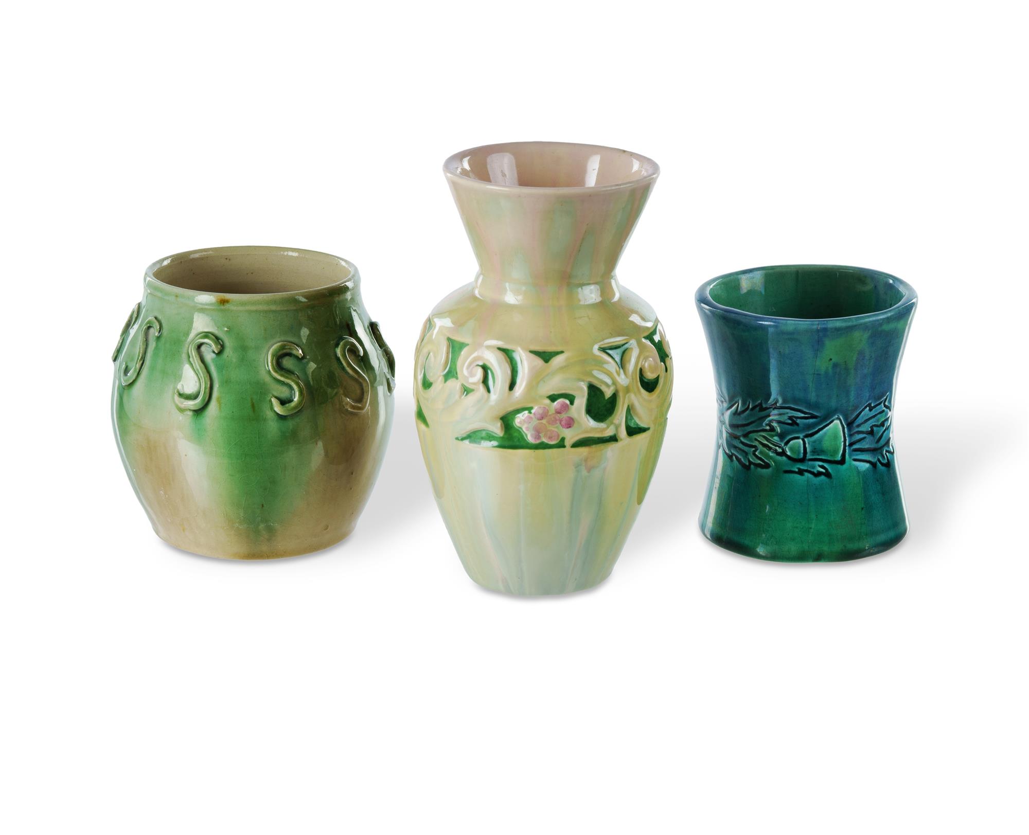 3 Harvey School Pottery Vases One by Maisie Murphy, and incised 'M.M.' to base, one signed 'Freeman', and one with monogram 'S.M.C.' 1924. H16.5cm (tallest)Estimate $150-300