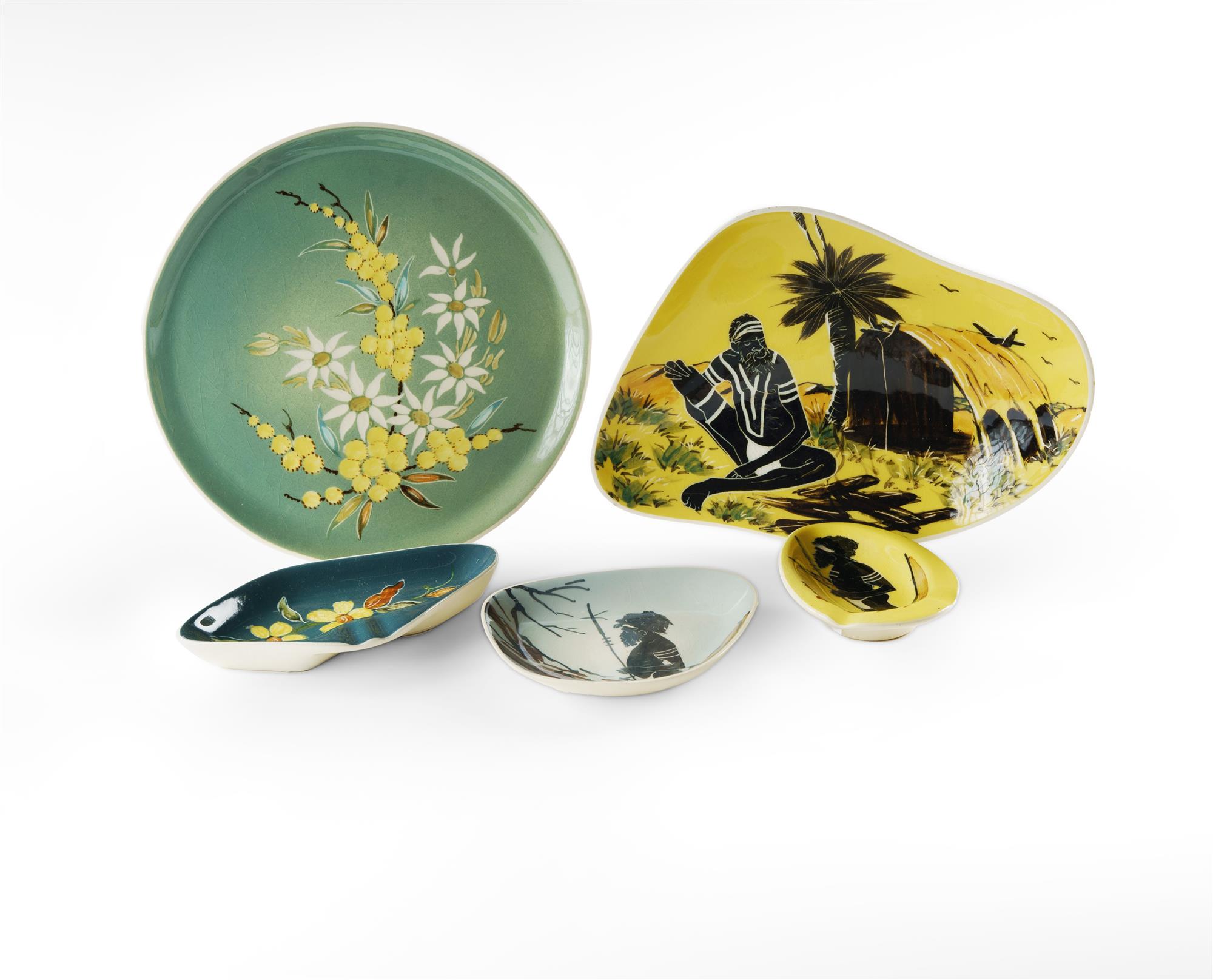 5 'Coronet Australia' Pottery Items With Aboriginal and native flower themes. Dia.24.5cm (plate)Estimate $80-150