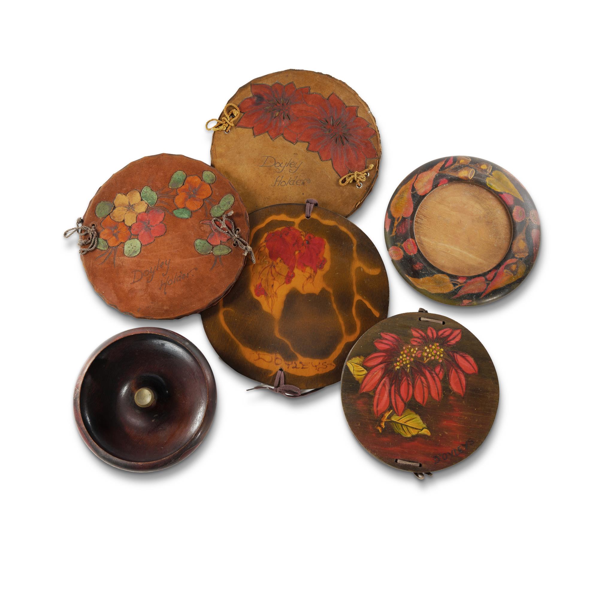 6 Various Australian Pyrographed Items Includes bread board; nut bowl; 2 leather and 2 wooden doyley holders.Estimate $50-100