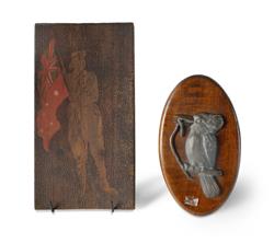 Cast Bronze Kookaburra with Snake Mounted on an oval wooden plaque, note veros reads 'produced from salvaged gun metal from HMAS Australia' (H27cm). Together with a pyrographed panel decorated with a WWI digger.Estimate $100-200