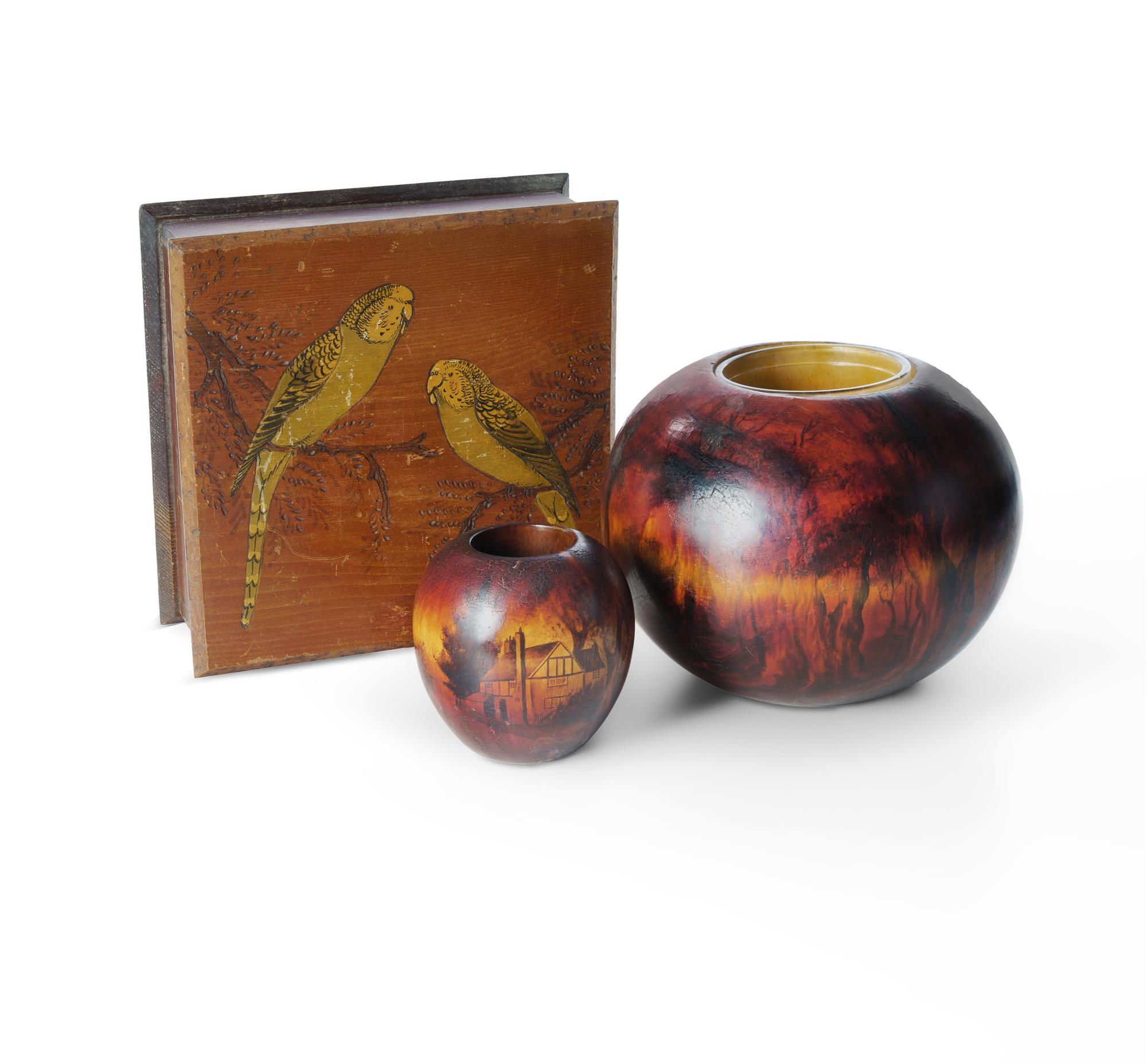 Pyrographed Australian Cedar Box Decorated with Budgerigars Together with 2 globose, painted wooden vases. Dia.19cm (vase)Estimate $50-80