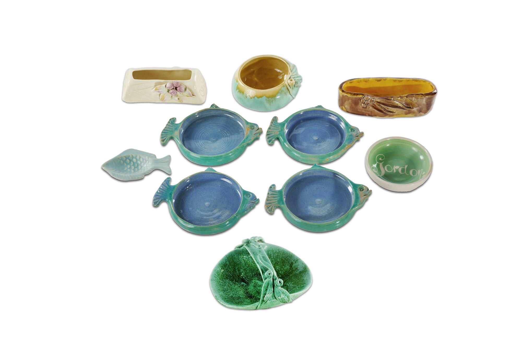 Group of Australian Pottery Items Various makers, mostly hand built with applied gumnuts and leaves to some. L17.5cm (trough vase)Estimate $150-300