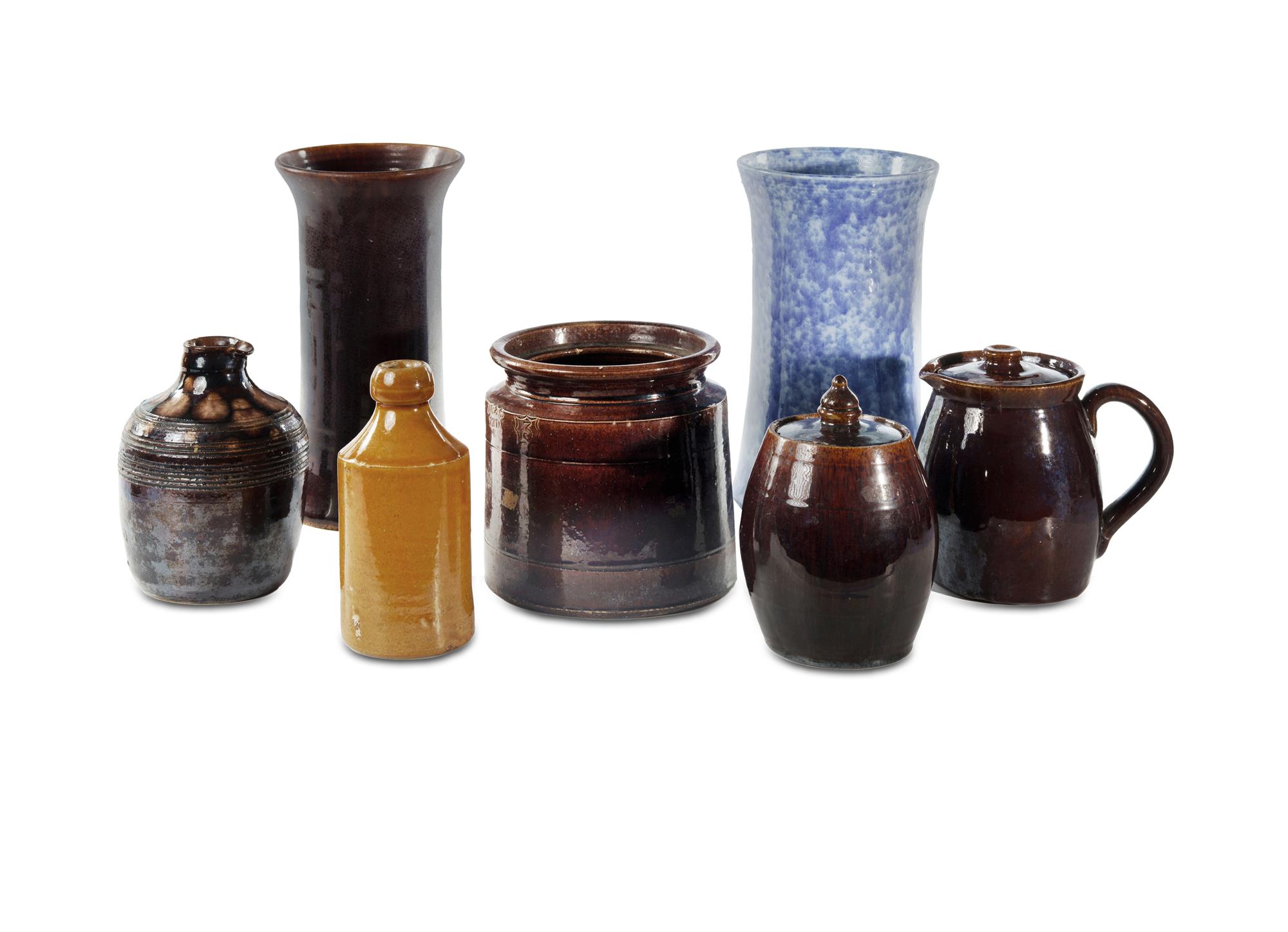 Group of 7 Colonial and Early 20th C Pottery Including fowler ginger beer bottle, jars, decanter, jug and 2 waisted vases. H26cm (tallest)