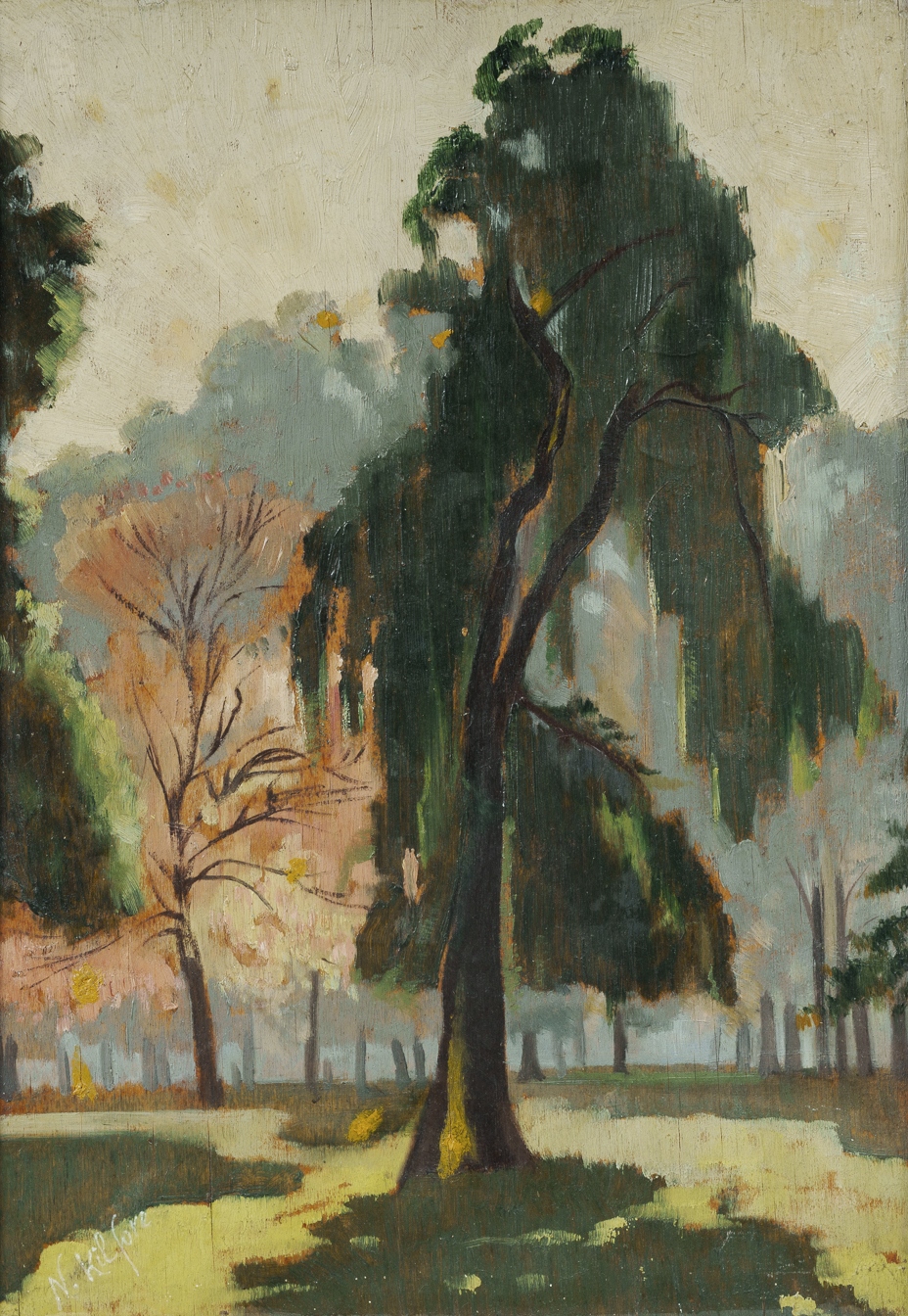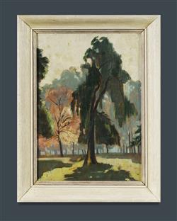 KILGOUR, Nancy May (1904-1954) Trees with Dappled Light Signed lower left. Authentication verso by Jack Kilgour. Oil on Panel 31.5x22.5cmEstimate $300-500