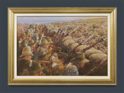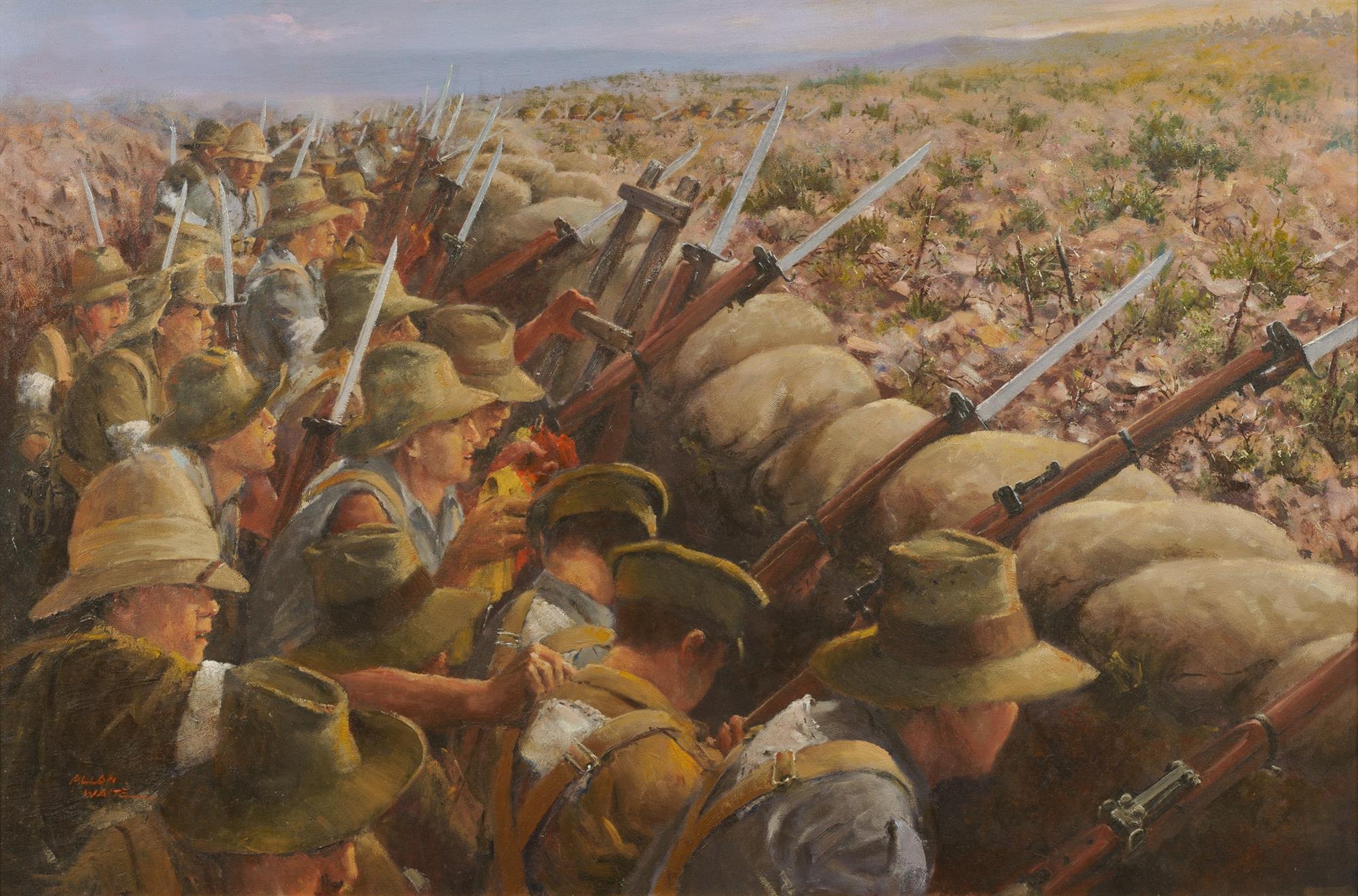 WAITE, Allan (1924-2010) 'Awaiting the Whistle-The Nek Gallipoli 7.8.1915 at 04.29 hours, 8 & 10 Light Horse Regiments' Oil on Board 60x90cmEstimate $300-500