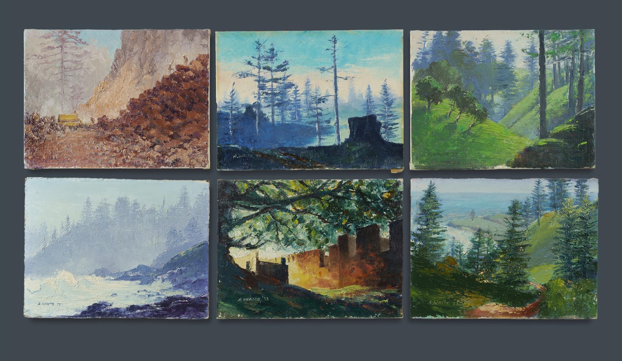 WAITE, Allan (1924-2010) (6) 'Evening, Norfolk', 'The Stables, Norfolk', 'The Quarry, Norfolk', 'Norfolk', 'Norfolk from Bloody Bridge', and 'Music Valley, Norfolk'. Oil on Canvas Board (6) 15x20cmEstimate $120-250
