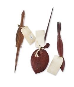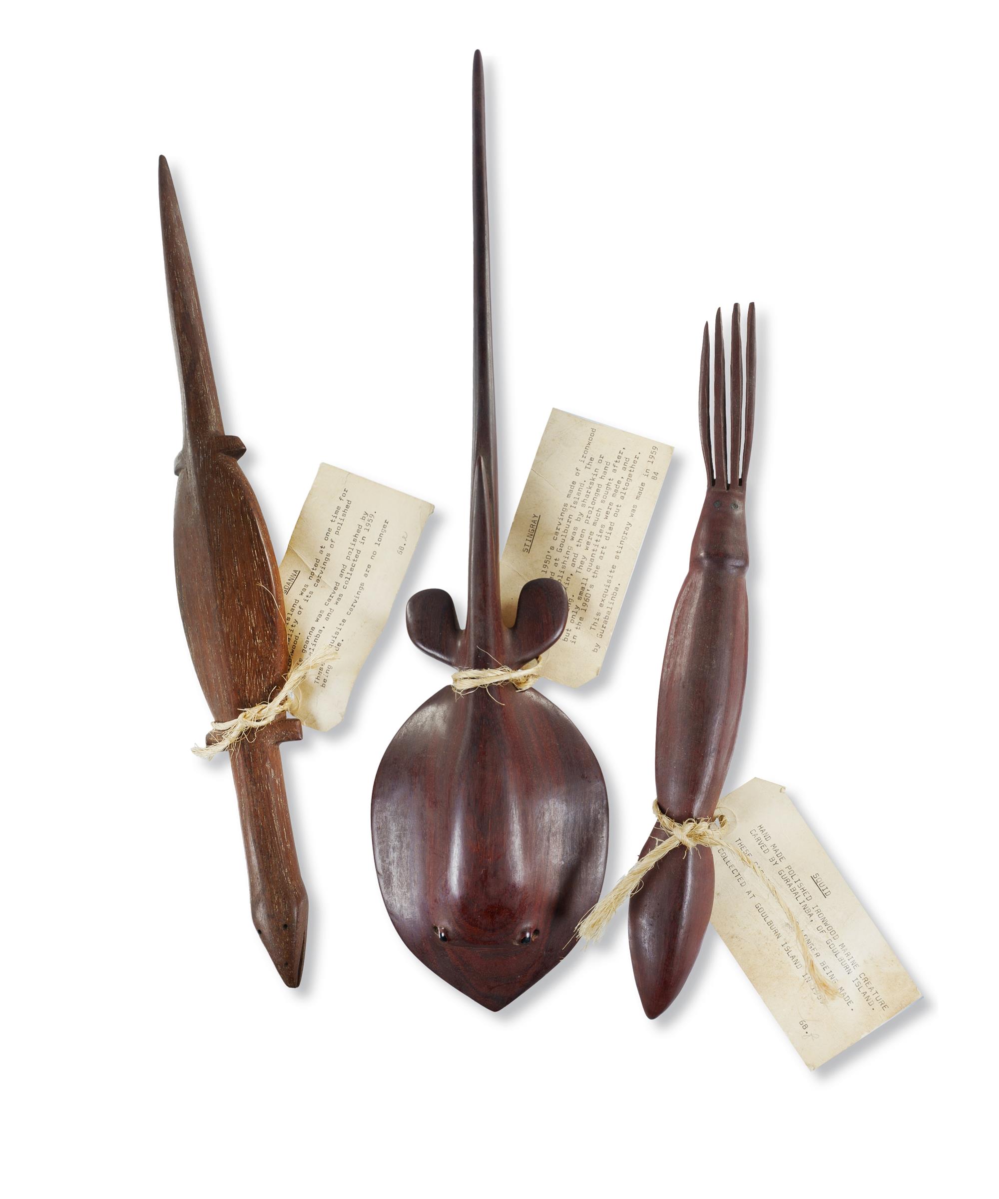 GURABALINBA, Michael (Aboriginal 1915-?) Three Polished Ironwood Carvings of Animals, 1959. Includes goanna, stingray, and squid. Ex Sotheby's. L50cm (stingray) PROVENANCE: Collection Mr H & Mrs P Wallace, Sydney.Estimate $400-600