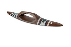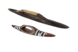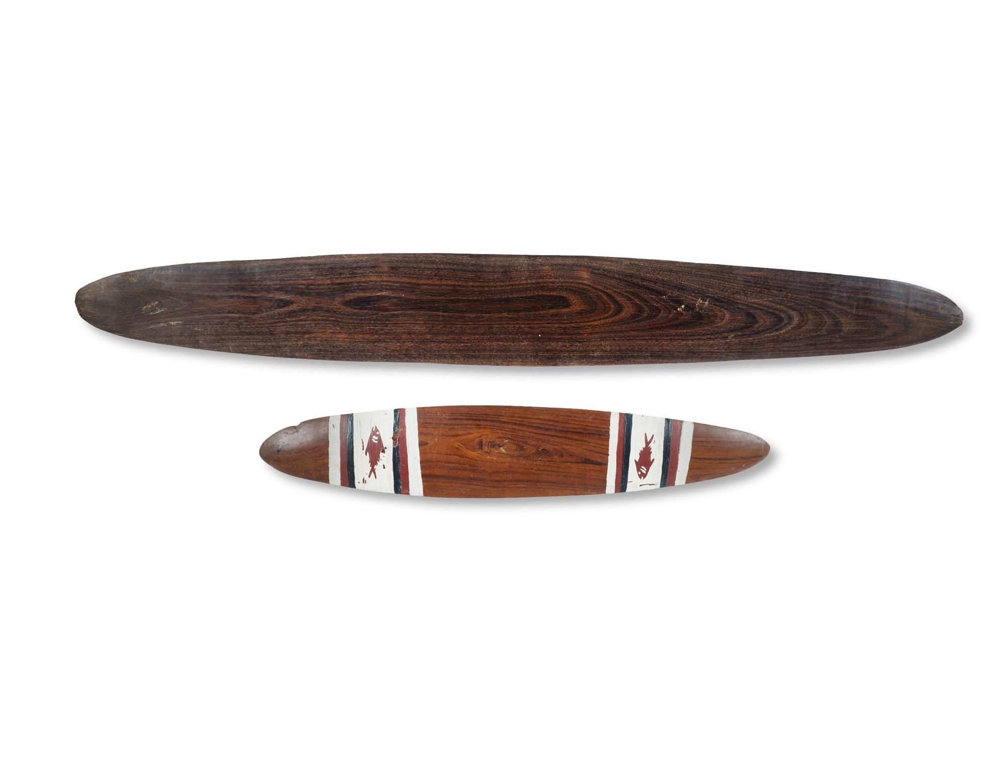 Two Tiwi Hardwood Shields One decorated with fish in natural earth pigments. (L80cm, & 41cm) PROVENANCE: Collection Mr H & Mrs P Wallace, Sydney.Estimate $250-450
