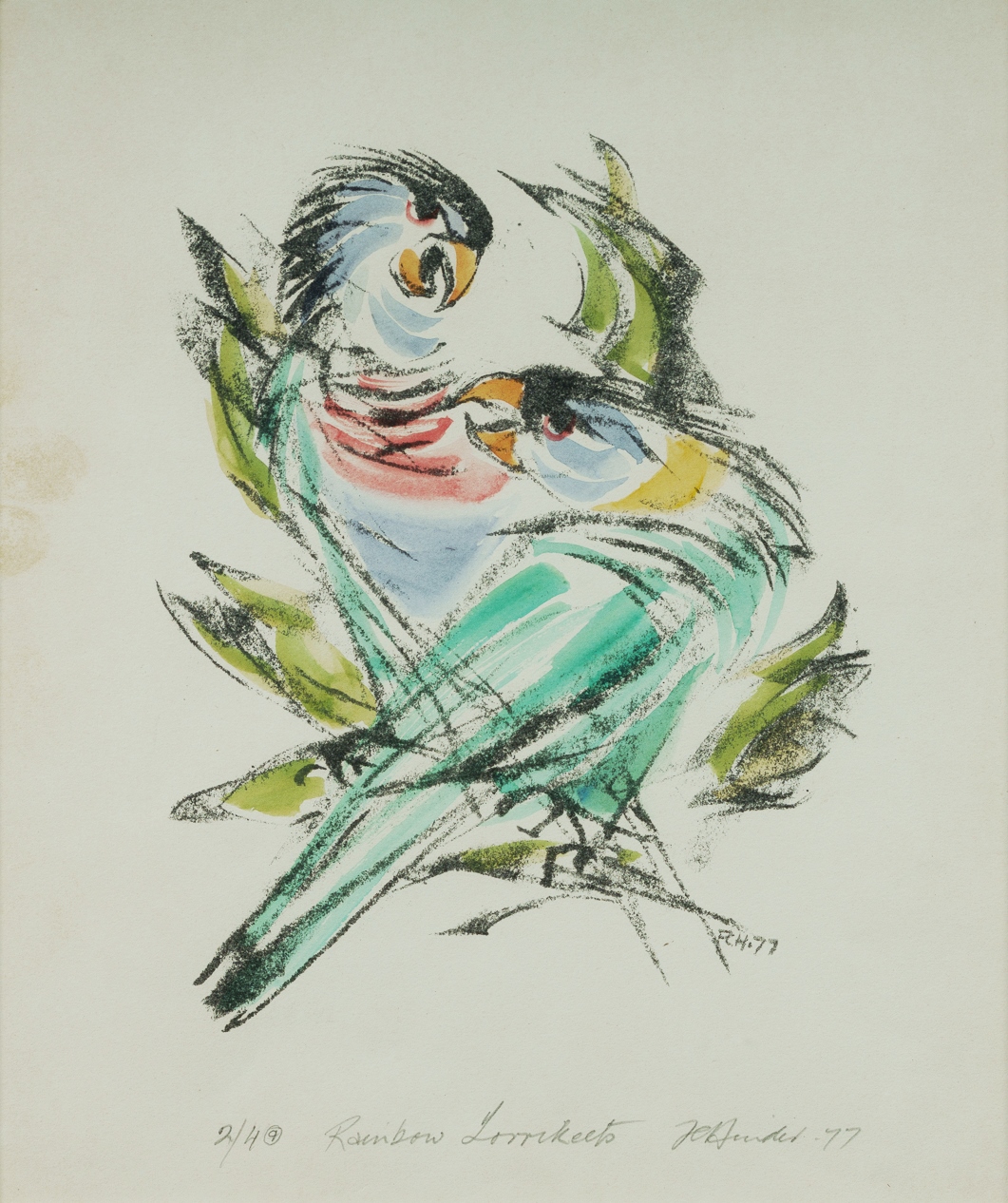 HINDER, F C (Frank) (1906-1992) 'Rainbow Lorikeets,' 1977. Signed lower right. Hand-Coloured Lithograph 2/4 24x20cmEstimate $450-750