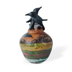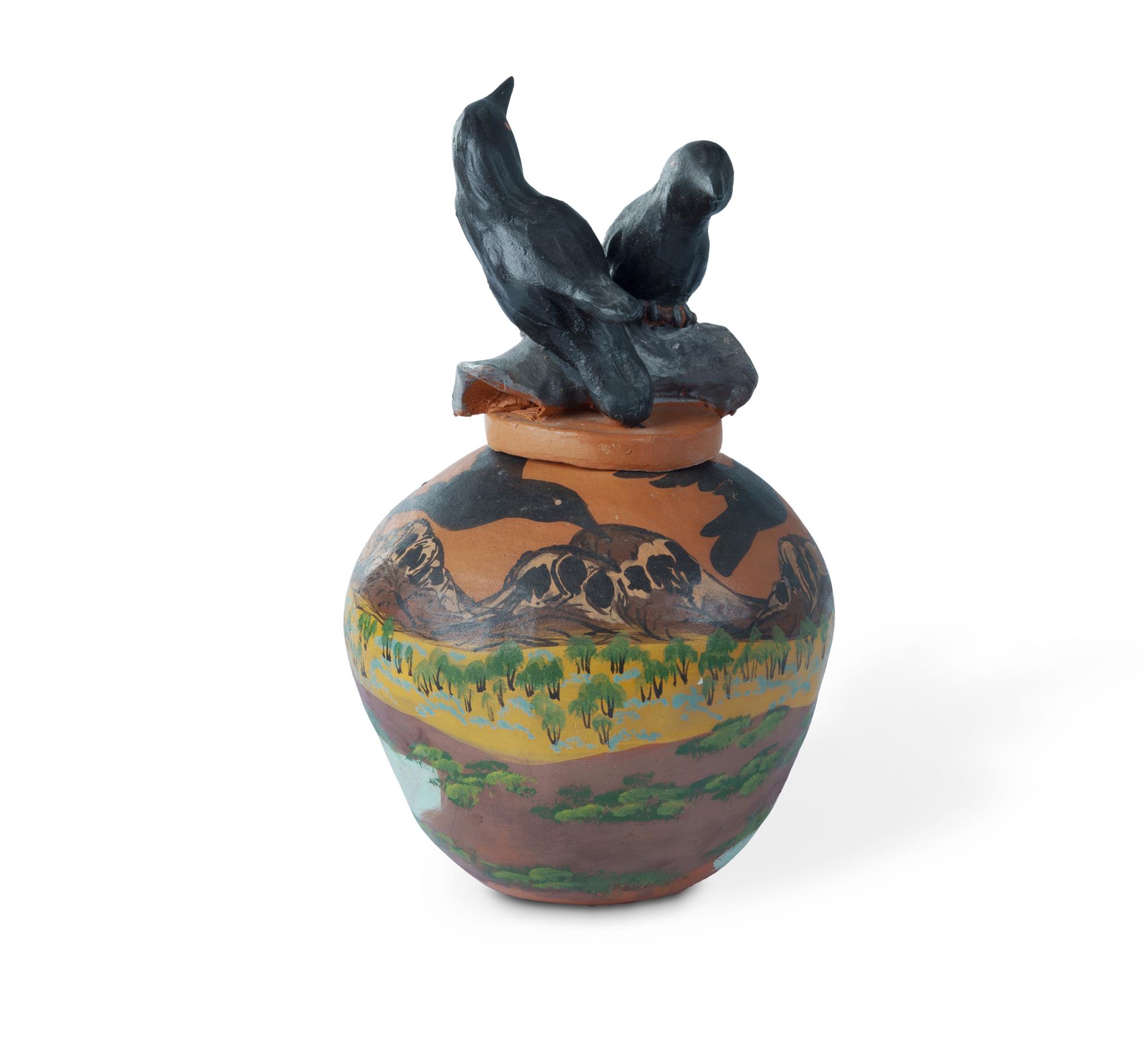RONTJI, Carol Panangka (Aboriginal 1968-2009) Hermannsburg Pottery Lidded Vessel Crows over a Central Australian landscape. Initialled 'CR', with cat #CR404 Painted Terracotta H24cm PROVENANCE: Janet Mansfield's Ceramic Art Gallery, Paddington, Sydney, c.2010; private collection, Sydney.Estimate $800-1,500