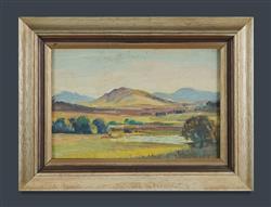 DUNDAS, Douglas Robert (1900-1981) Canberra Landscape Signed lower left. Remnants of old label verso. Oil on Board 14x22cmEstimate $400-600