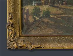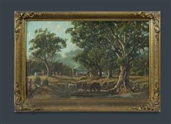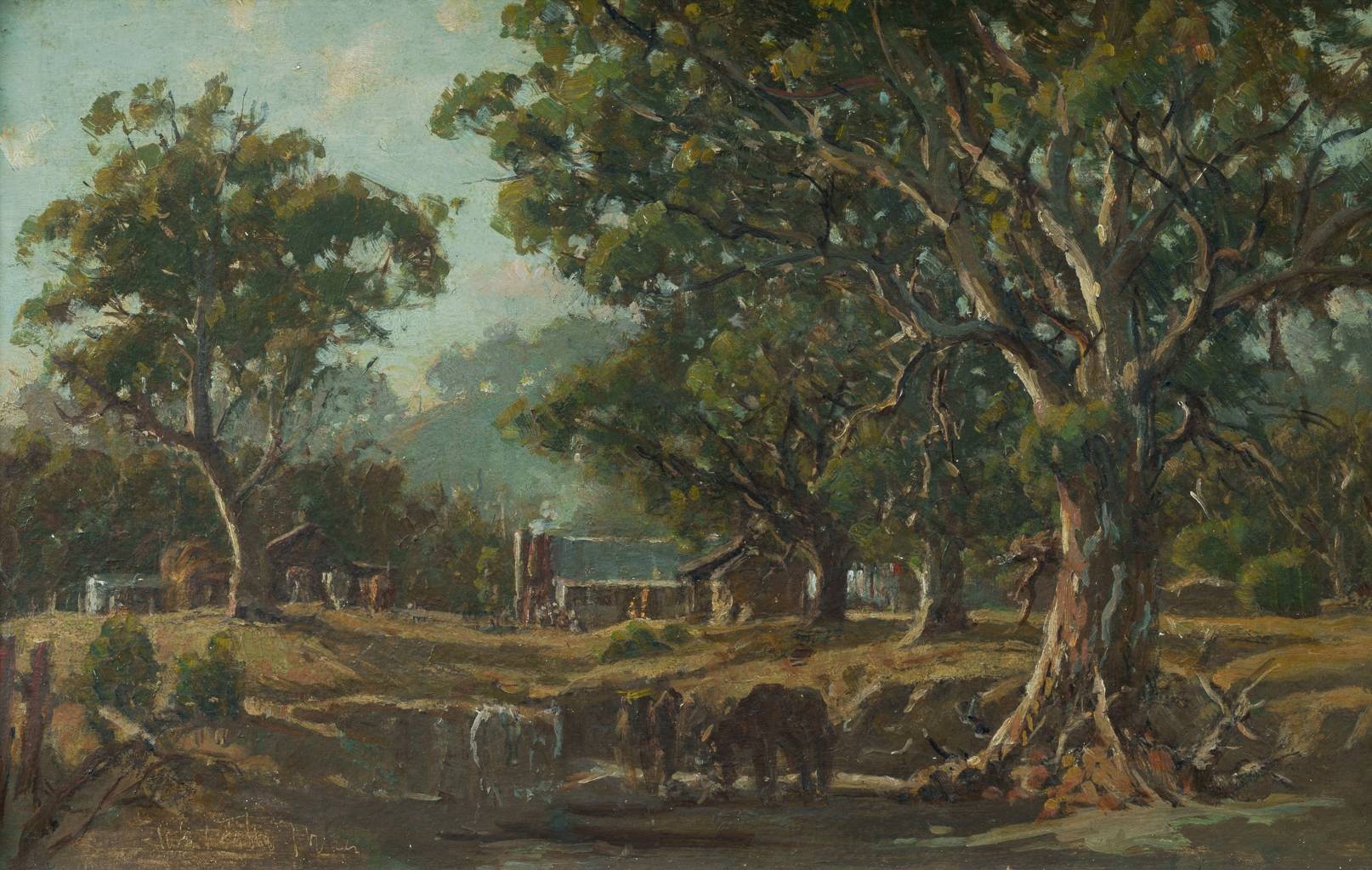 TAYLOR-GHEE, Robert Eagar (1869-1951) Settler's Home with Grazing Horses Signed indistinctly lower left. Oil on Canvas 29.5x47cmEstimate $600-1,000
