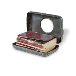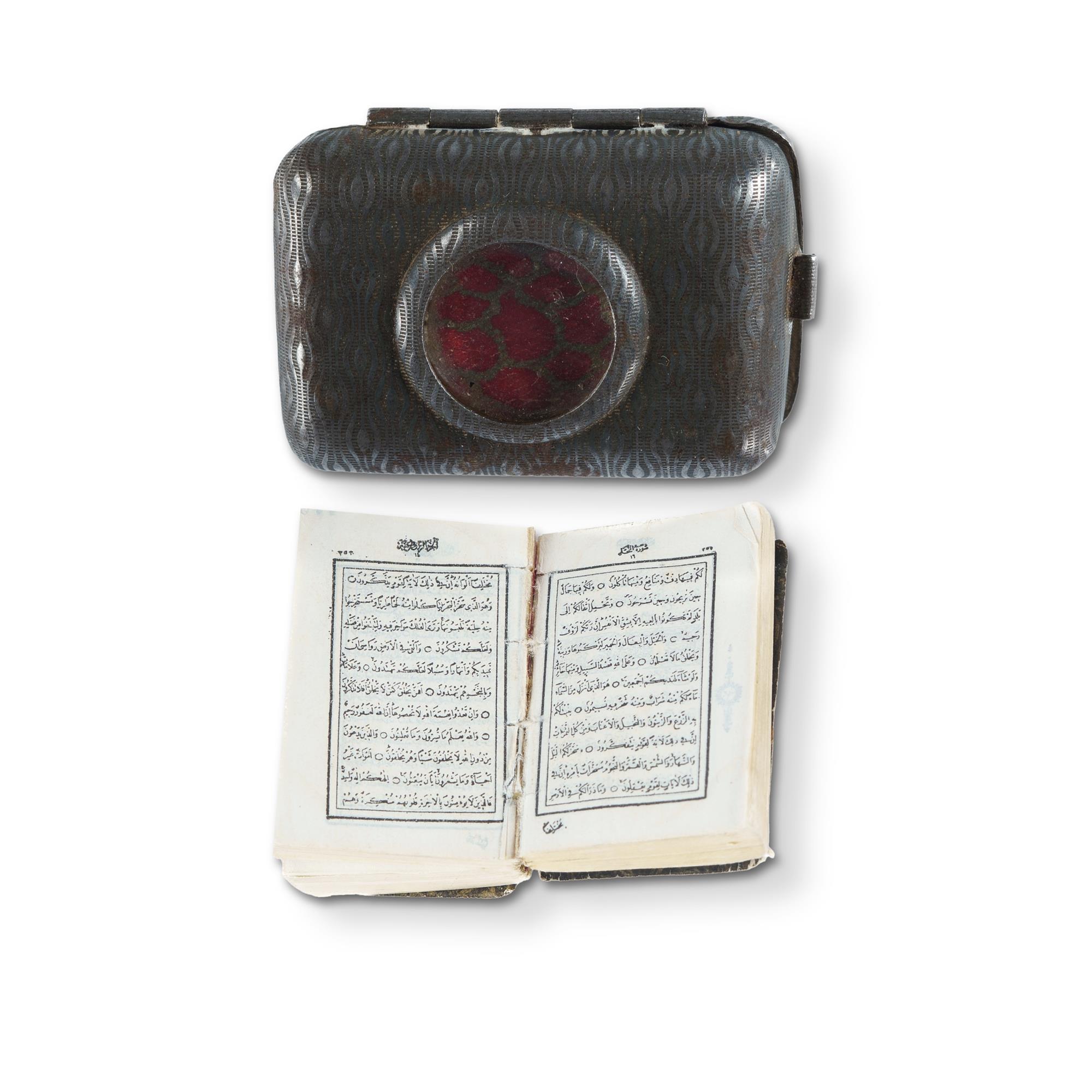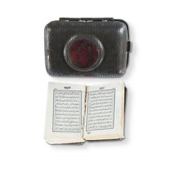 Miniature Quran, Late 19th or Early 20th C. Likely published by David Bryce of Glasgow, famous publisher of miniature books. In original engine turned steel case, set with magnifying glass. These Qurans were issued to British muslim troops in both world wars, and often worn as a talisman. 4.5x3cm (case)