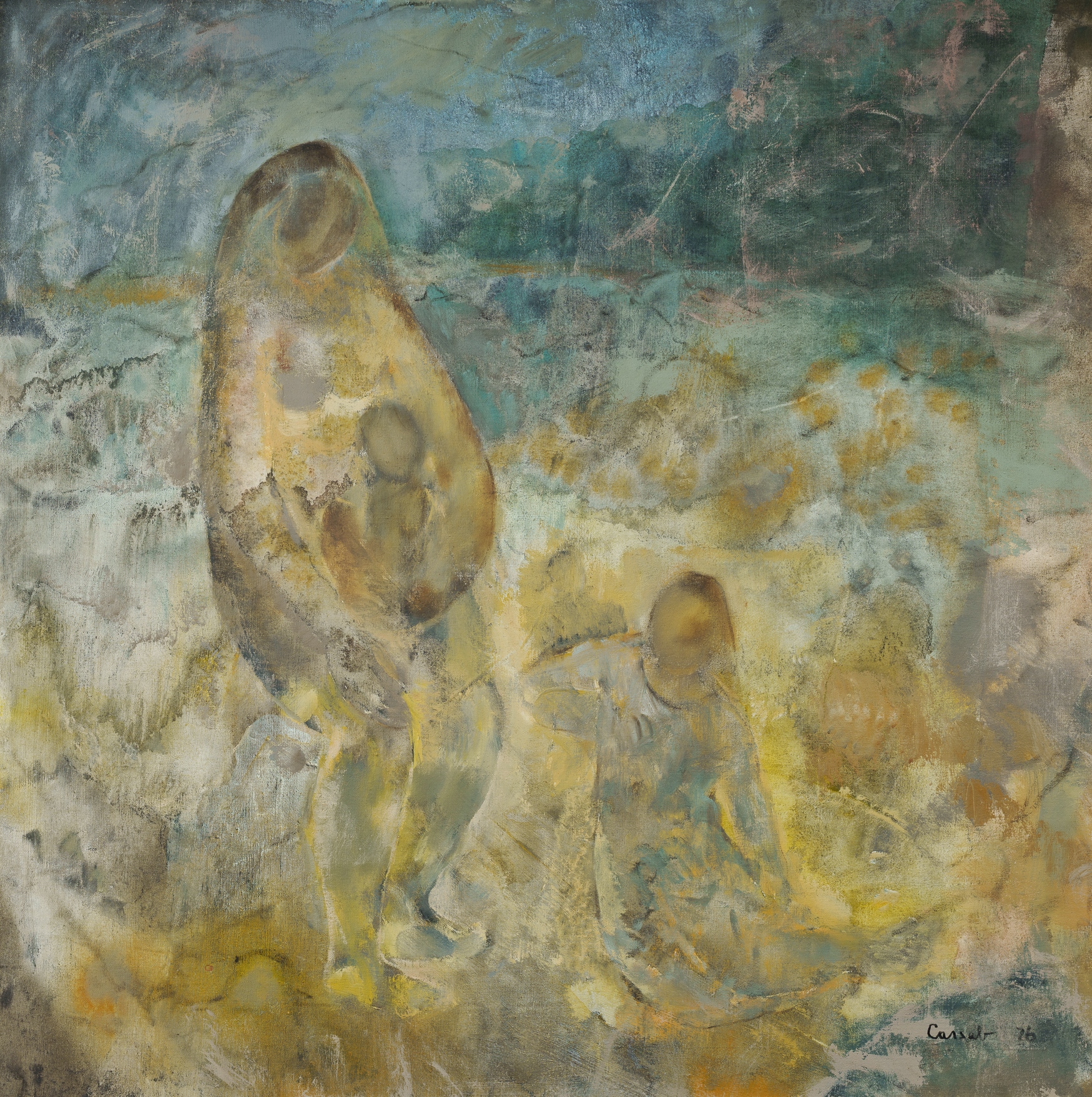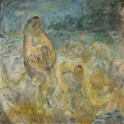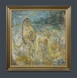 CASSAB, Judy (1920-2015) 'Sun-drenched Group, Bali,' 1976. Signed lower right. Personal inscription verso 'To Max [Taylor], with love, from Judy'. Oil on Canvas on Board 72x72cm