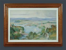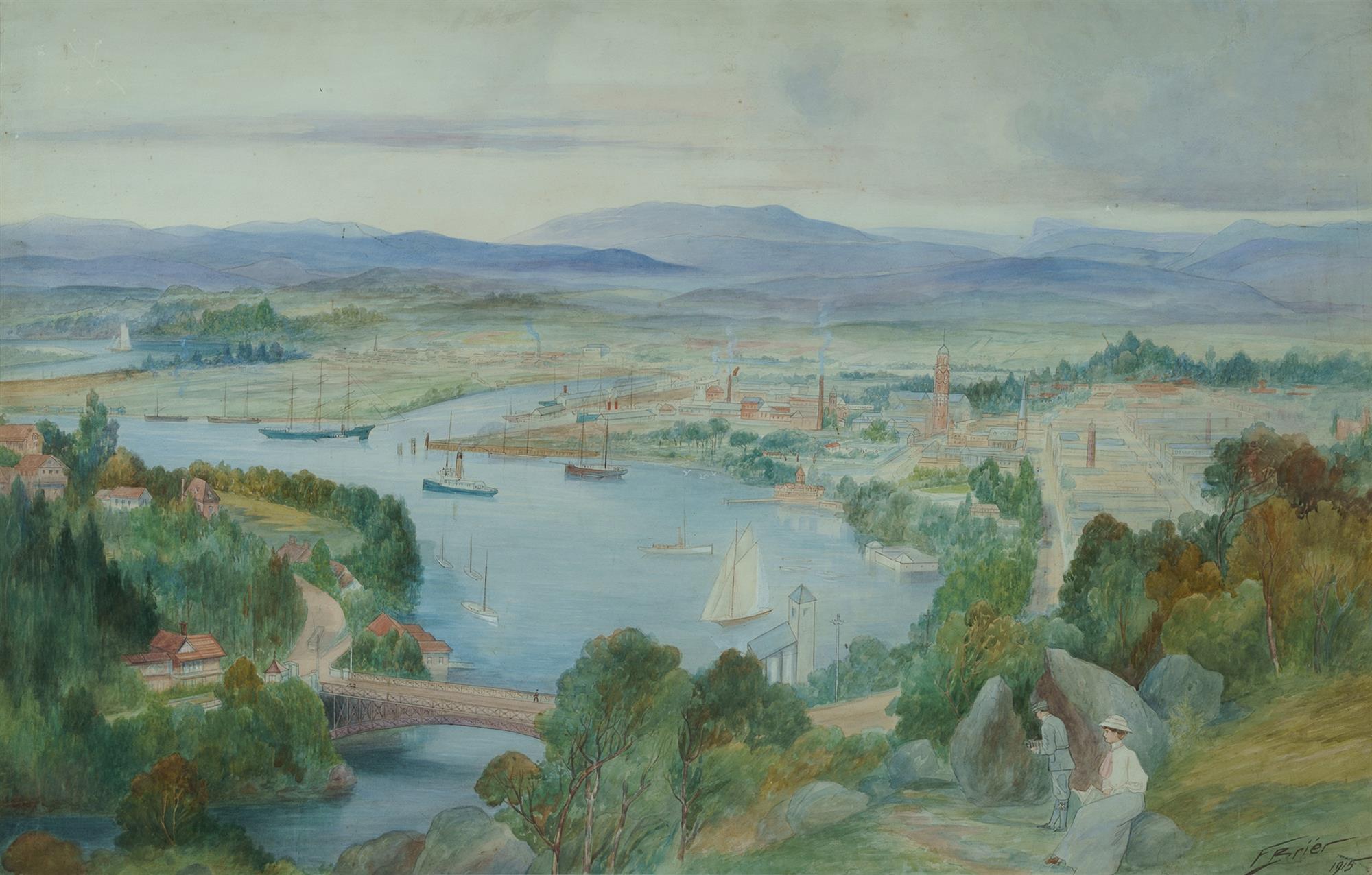 BRIER, Frederick (1854-1922) Launceston, 1915. Signed and dated lower right. Two other views of Launceston by the artist are in the Queen Victoria Museum and Art Gallery, Launceston. W/Clr & Gouache 62x96.5cm