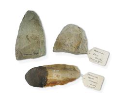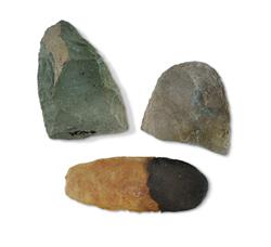Two Australian Aboriginal Stone Axe Heads Together with a stone woman's knife with resin handle. L14.5cm (knife) PROVENANCE: Collection Mr H & Mrs P Wallace, Sydney.Estimate $100-200