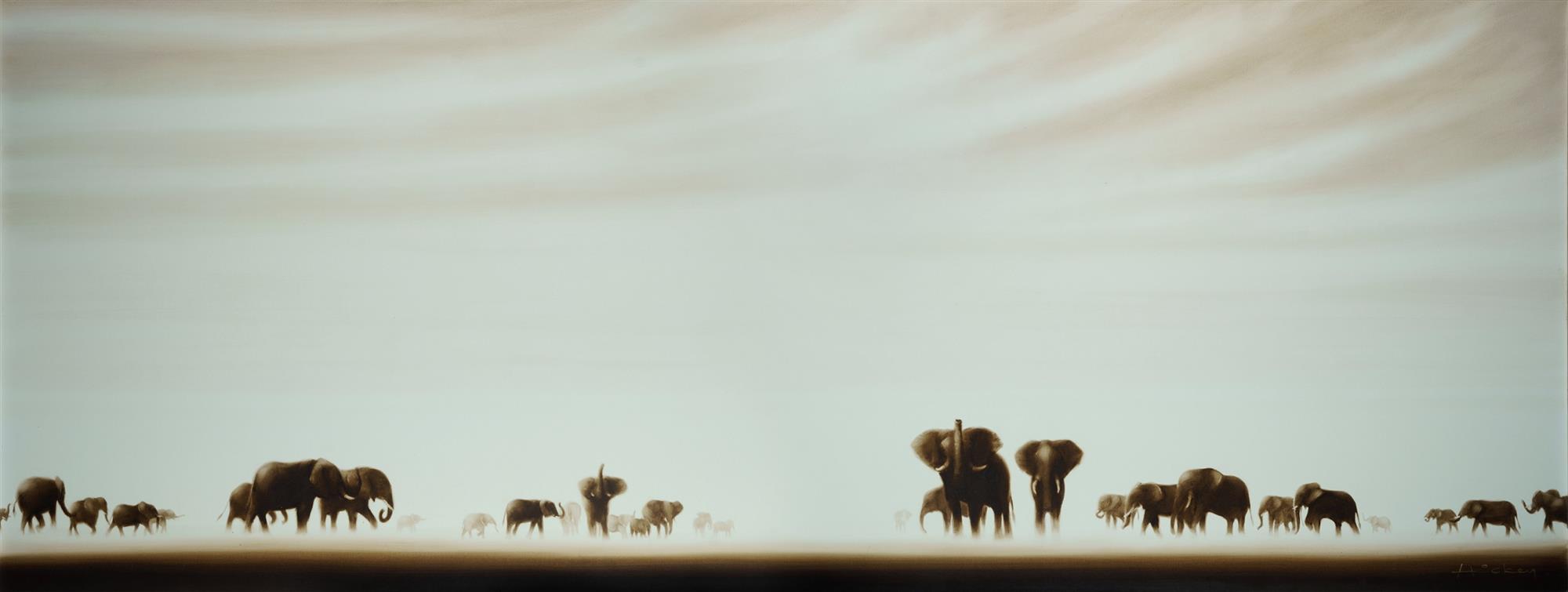 HICKEY, Peter (b.1943) 'Elephant Kingdom,' 2002. Signed lower right. Oil on Canvas 106x280cm PROVENANCE: The artist; Bell Gallery, Berrima, NSW; private collection, NSW.Estimate $1,500-2,500