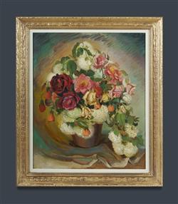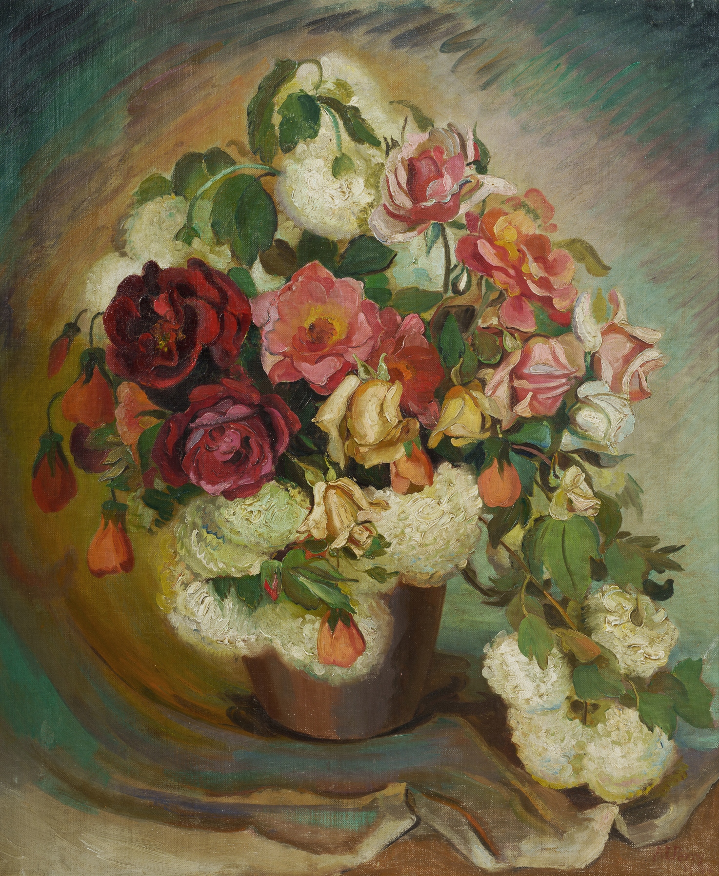 PERRY, Adelaide Elizabeth (1891-1973) Roses and Snowballs,' 1944. Signed lower right. Oil on Canvas on Board 75x62.5cm EXHIBITIONS: Artarmon Galleries, Sydney, November 2017, cat #17.Estimate $1,800-3,000