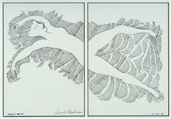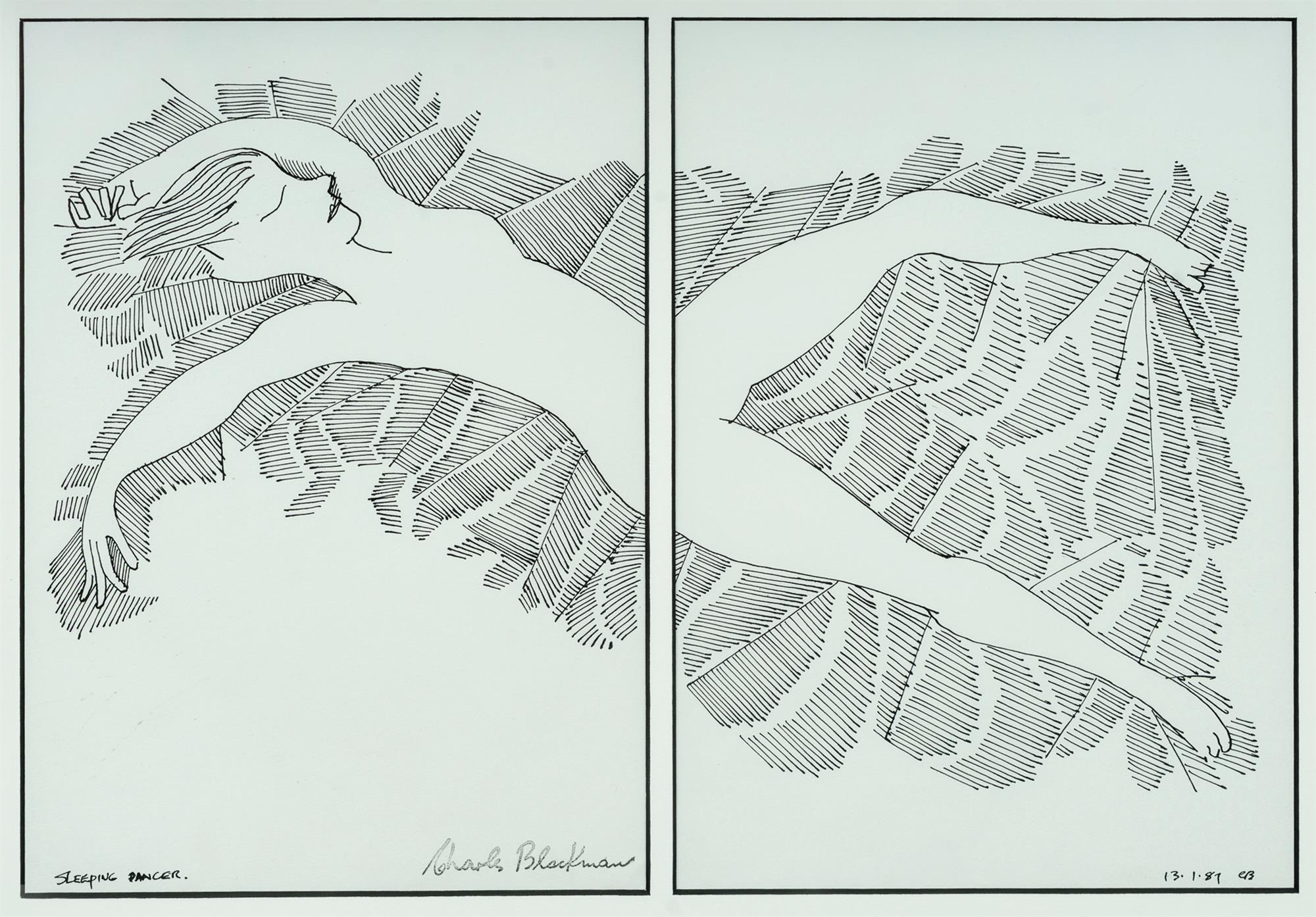 BLACKMAN, Charles (1928-2018) 'Sleeping Dancer [Diptych]' 1987. Initialled lower right (right sheet) Stamp signature lower right (left sheet) Pen & Ink 34x49cm (overall) 34x24cm (each sheet)Estimate $800-1,500