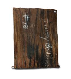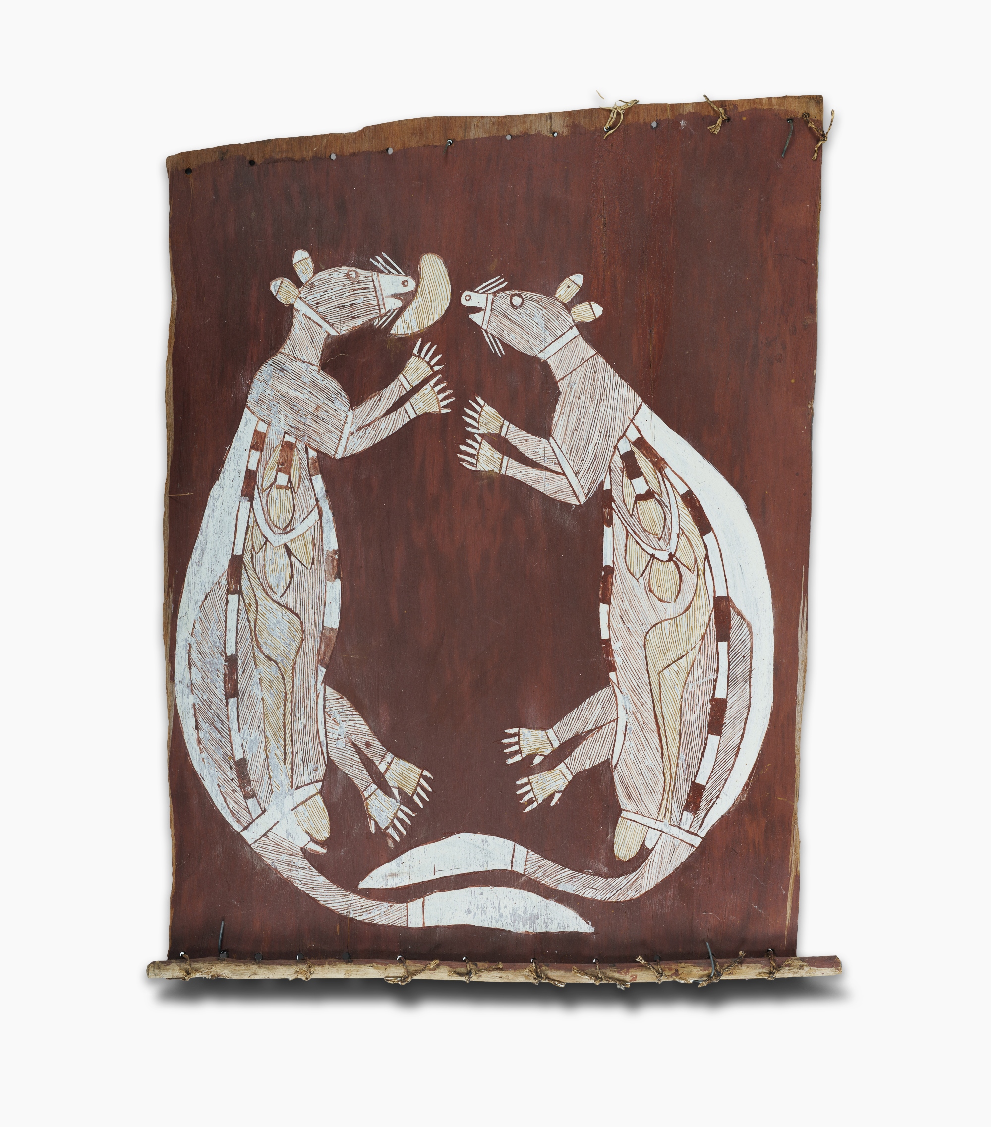 GALEREYA, Jimmy (Aboriginal c.1937) Two Kangaroos Inscribed in chalk verso (#18) Natural Earth Pigments on Eucalyptus Bark 64x50cmEstimate $300-600
