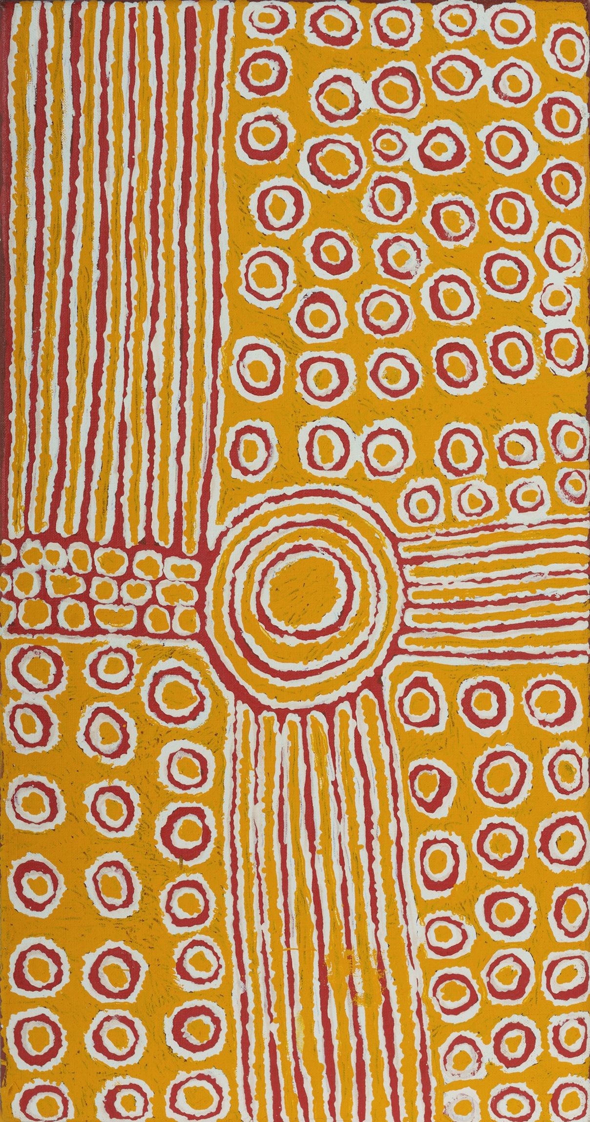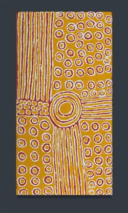 NUNGURRAYI, Pantjiya (Aboriginal born c.1936) Rockhole Site of Kungkiyunti, 2011. Acrylic on Linen 61.5x31.5cm PROVENANCE: Papunya Tula Artists, cat #PN1107063 (certificate included); private collection, Sydney.Estimate $300-500