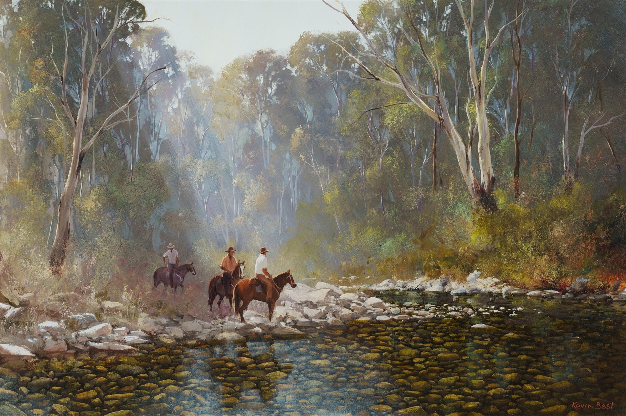 BEST, Kevin (1932-2012) 'The Search Party, Delatite River' Signed lower right. Oil on Board 50x75cmEstimate $1,800-3,500