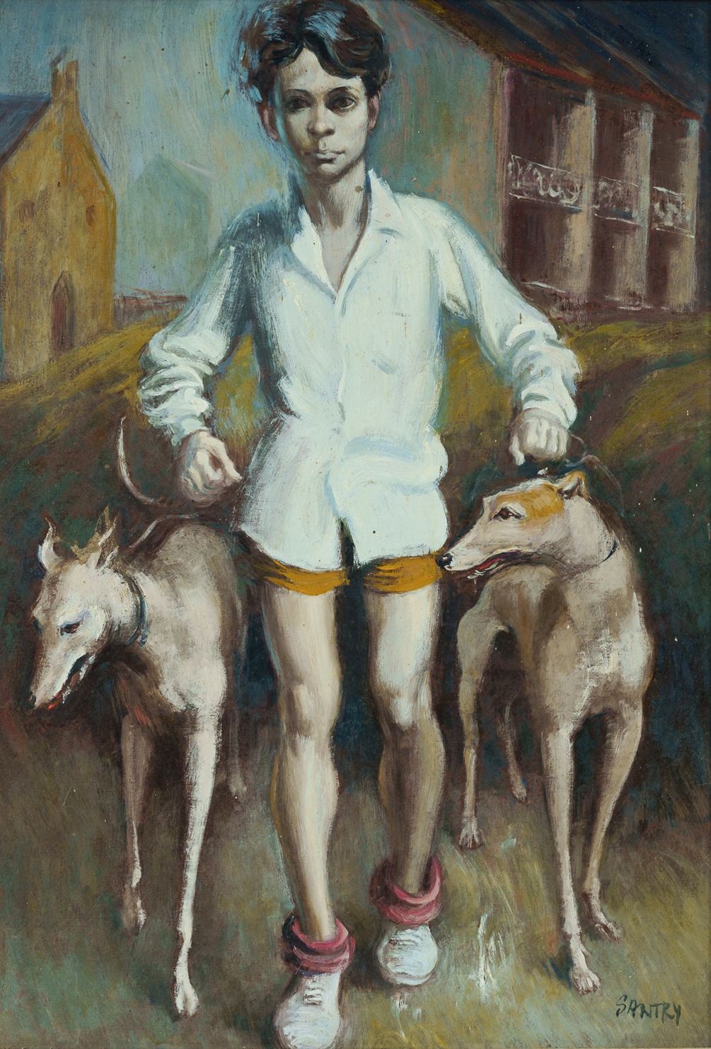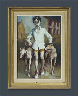 SANTRY, John (1910-1990) Boy with Greyhounds Signed lower right. Oil on Board 46x32cmEstimate $800-1,200