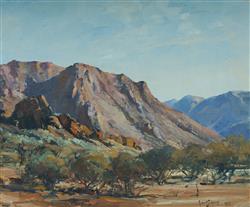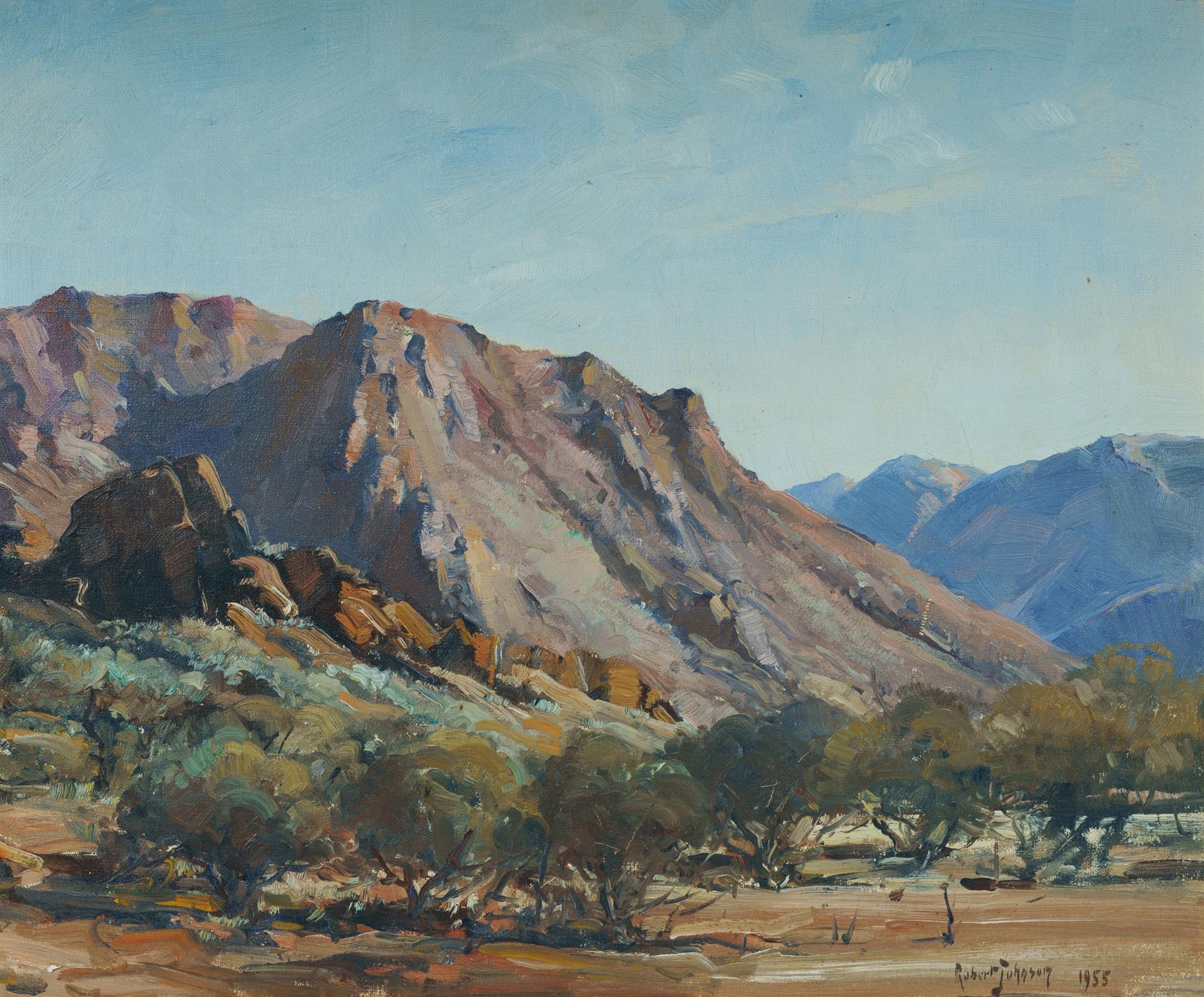JOHNSON, Robert (1890-1964) Mountain and Mulga, 1955. Oil on Canvas on Board 36x44cm PROVENANCE: Christie's, Sydney, October 3rd 1972 (lot 259); Collection Mr H & Mrs P Wallace, Sydney.Estimate $500-800