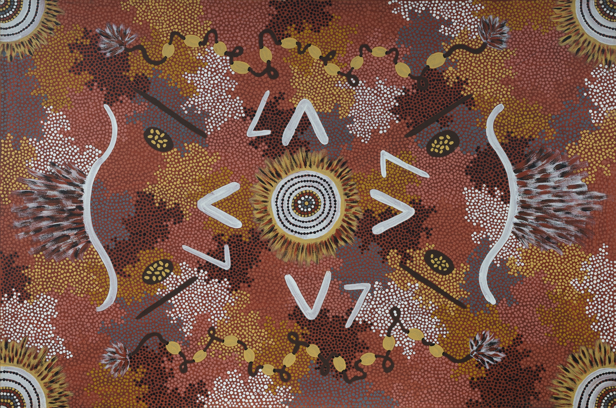 TJAPANANGKA, Dick Lechleitner (Aboriginal 1944-2001) 'Muny Muny, Women Dreaming,' c.1987. Inscribed verso. Acrylic on Canvas 91x61cm PROVENANCE: Town Bore, Haast's Bluff (purchased 1987); Collection Mr H & Mrs P Wallace, Sydney.Estimate $300-500