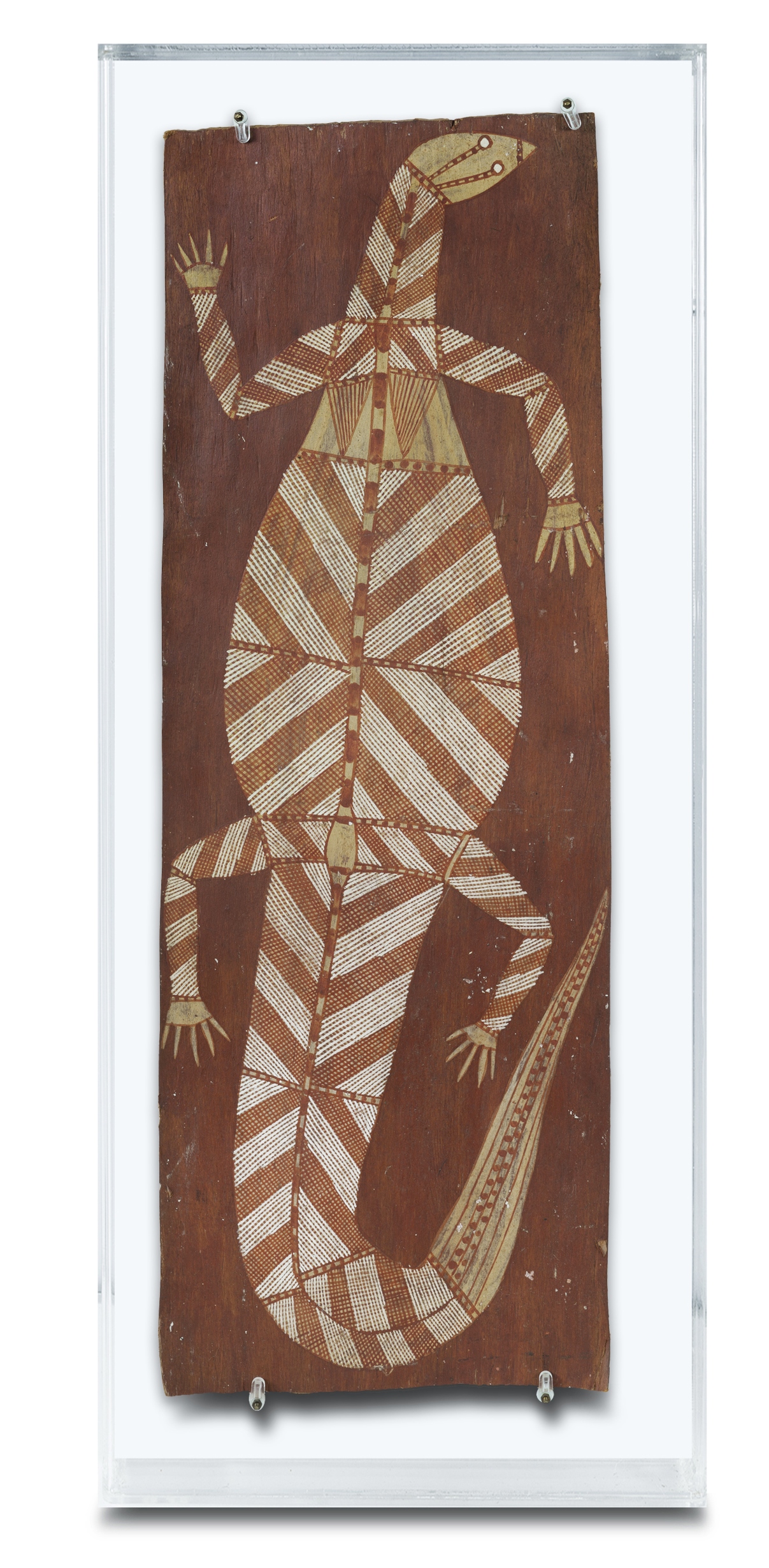 OTHER NOTES: Documentation verso, 'The goanna depicted here is one of the artist's chief totems. He has painted it with his clan design. Goanna is also connected with the Ubar ceremony of Western Arnhem Land.'