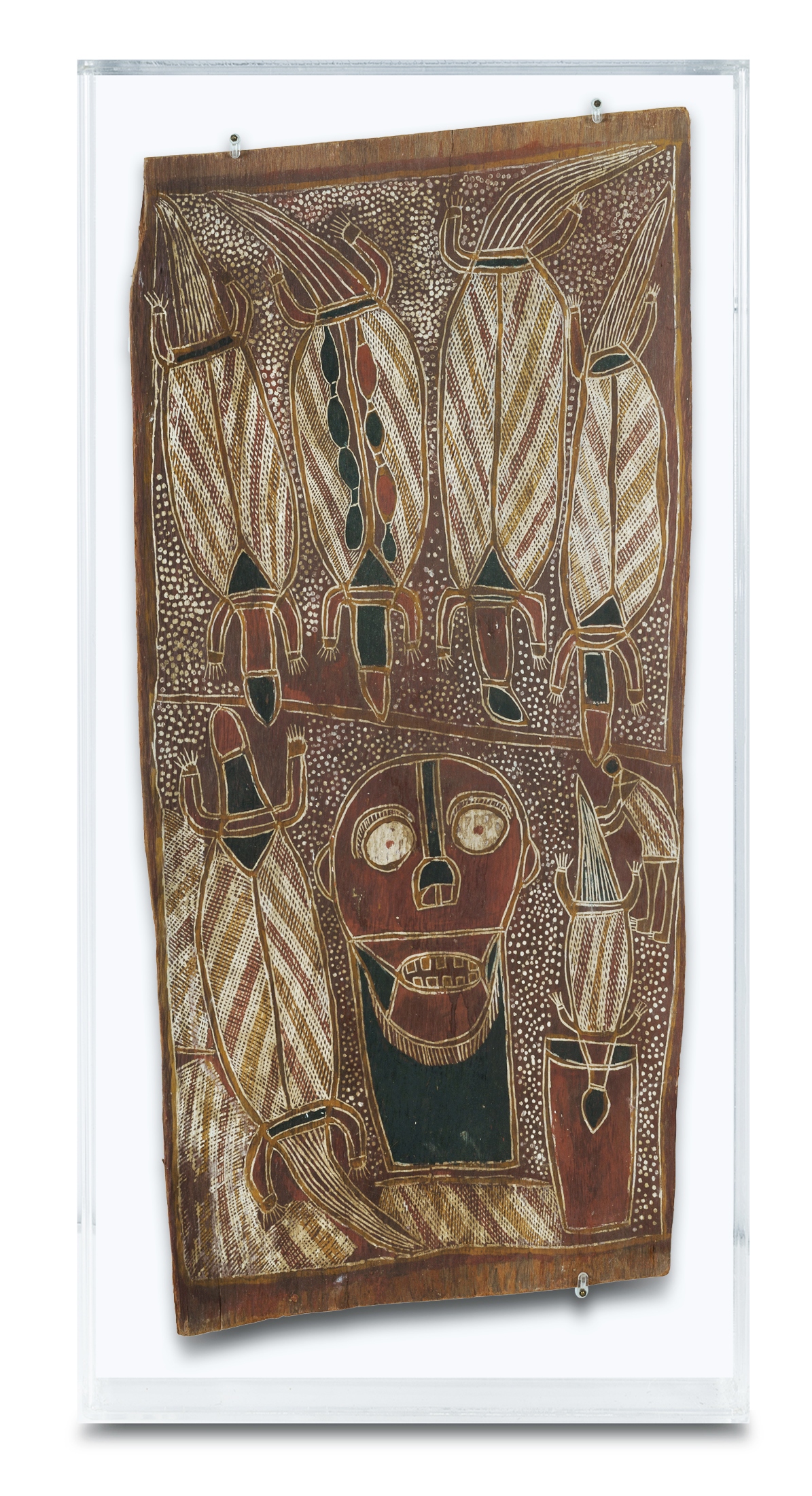 OTHER NOTES: According to the accompanying documentation this painting was collected at Maningrida in 1958. The documentation reads in part: 'When a man of the Gupapuynga tribe dies he is buried in a shallow grave. Then about 18 months later his bones are dug up painted with red ochre and placed in a hollow log which is highly decorated with the clan designs and totems. This log djalambu is then placed upright in the ground. It usually has one or two holes carved near the top to represent the eyes of the spirit looking out at the ceremony being performed in his honour. The skull of the dead man is also painted with his clan design kept by his relatives for a long time and then deposited in the sacred waterhole from which his spirit came in the first place. Death is usually attributed to sorcery as it is believed even today that nobody dies from natural causes. Often it is alleged that another person has 'sung' the victim and then revenge is sought so that payback can continue for many generations as one kills the other off. At the ceremony various songs and dances are performed during which totems consisting of paperbark tightly bound with bush string and shaped in representations of birds fish or animals are displayed to the participants. One of the most important of these is diver duck. Bullroarers are usually swung around the head and the whistling noise is said to be the sound of the diver ducks flying back to the island of spirits with the spirit of the dead man. The spirit leaves the body and goes back into the sacred water hole from which the dead man had emerged at birth. On his death the spirit may turn into a catfish or other marine creature and is captured by the diver duck sitting on a nearby tree'
