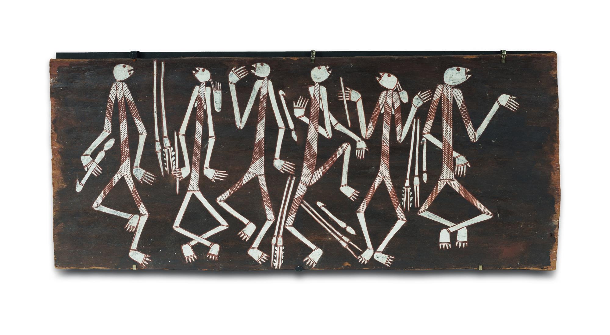 NANGAWILA NGAINMIRA 'Mimis with Weapons' c.1977. Dorothy Bennett collection (possibly no. 105A or B) Natural Earth Pigments on Eucalyptus Bark 33x78cm PROVENANCE: Dorothy Bennett, 1977; Collection Mr H & Mrs P Wallace, Sydney.Estimate $450-750