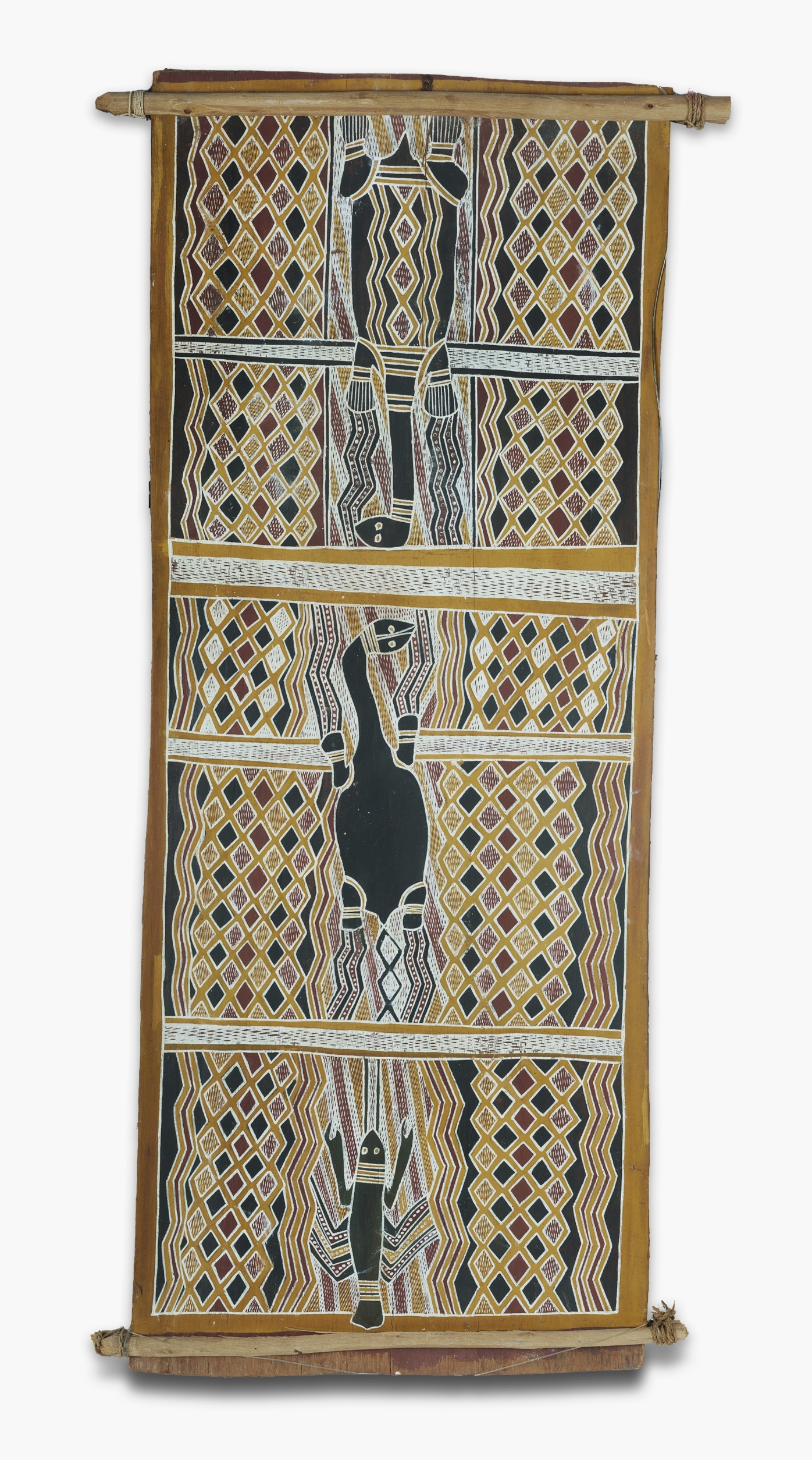GUMUG 'Minala, the Dreamtime Tortoise' c.1958. Dorothy Bennett collection (possibly no.101) Natural Earth Pigments on Eucalyptus Bark 114x44cm