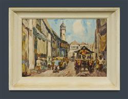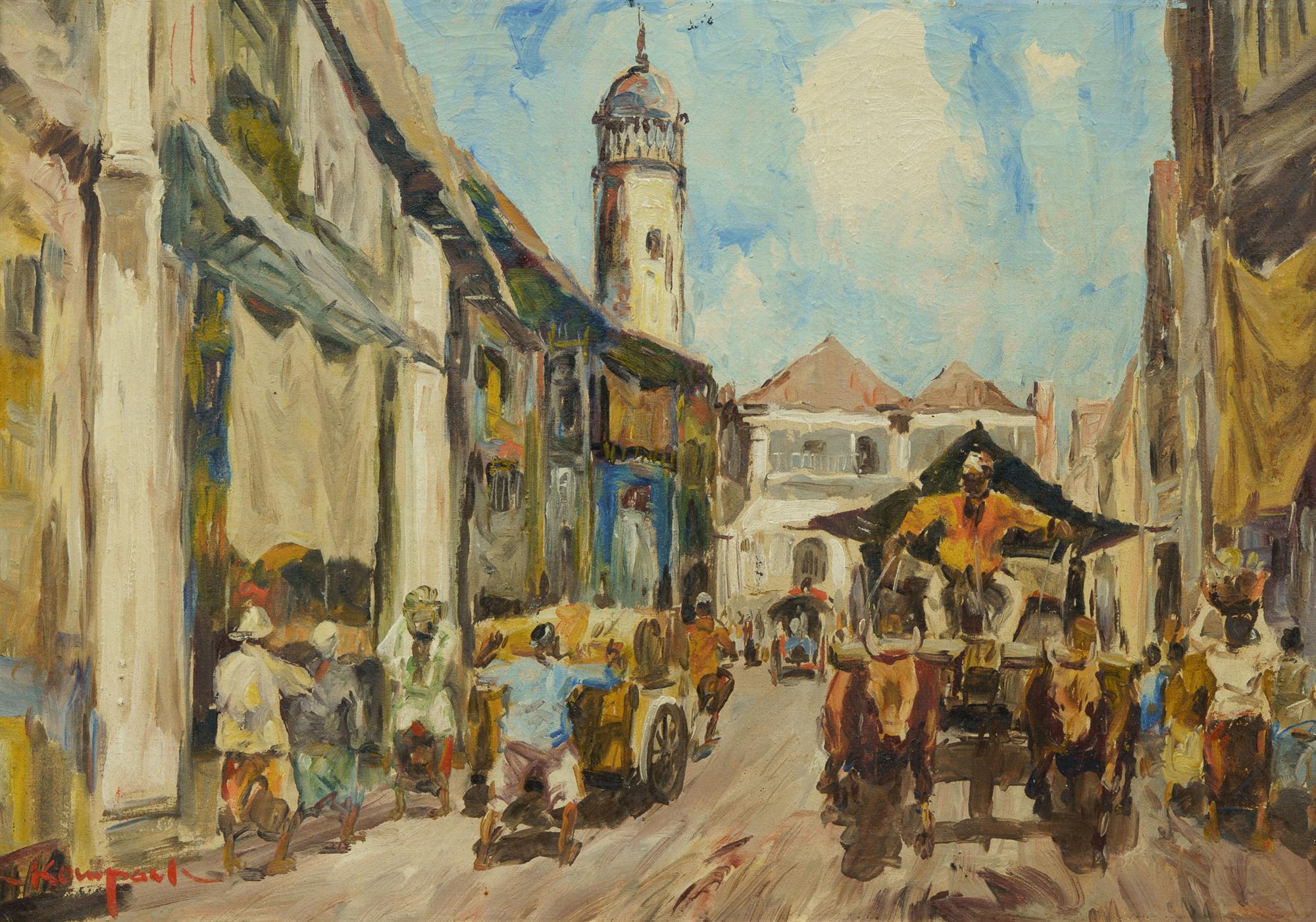 KOEMPOEL, Sujatno (Indonesian 1912-1987) Ox Cart and Street Traders Signed lower left. Oil on Canvas 40.5x58.5cmEstimate $250-450