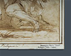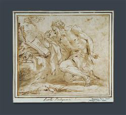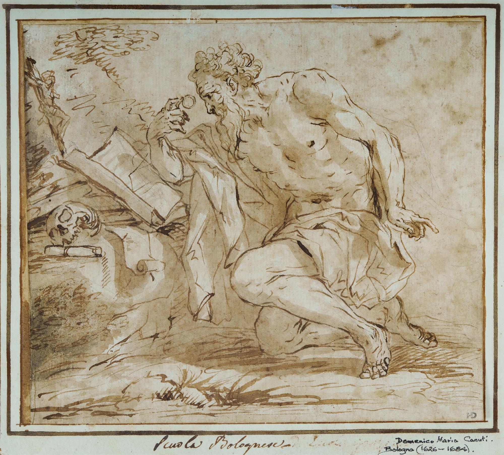Attrib. CANUTI, Domenico Maria (Italian 1626-1684) 'St Jerome in Penitence' Harold Day (The Day Collection, UK) stamp lower right. Inscribed to border and verso. Ink & Wash 17x19.5cm (laid on paper 19.5x21.5cm) PROVENANCE: Harold Day, UK (Ref.146/F2A)Estimate $1,500-3,000