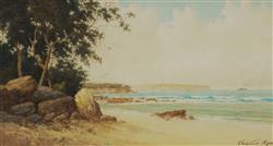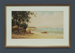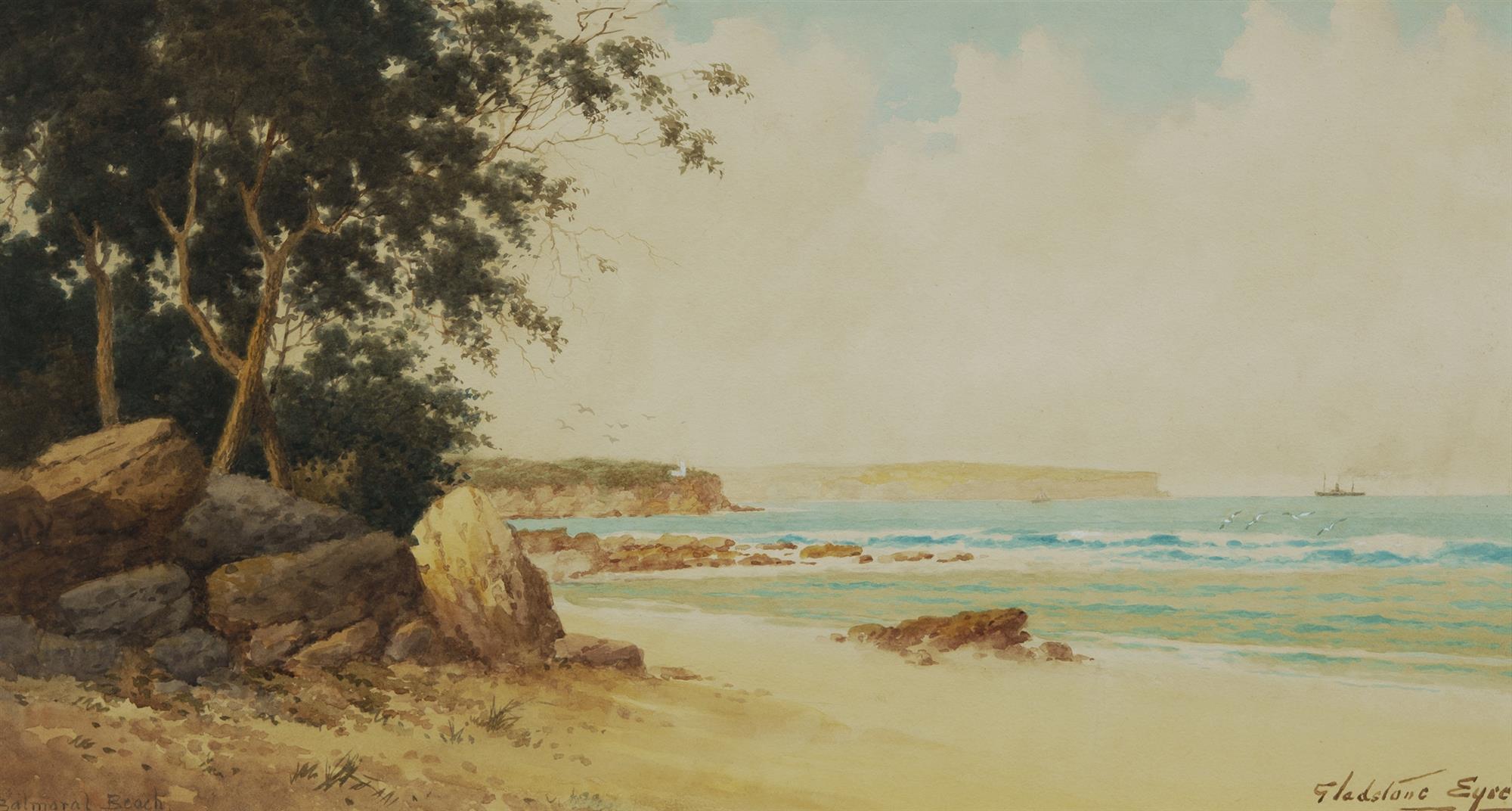 EYRE, Gladstone (1863-1933) 'Balmoral Beach (with View to Dobroyd Head and North Head) Signed lower right. W/Clr 30.5x57cm PROVENANCE: Davidson Auctions, May 23rd 2015 (lot 91); Collection of Jim Haynes OAM and Robyn McMillan.Estimate $200-400