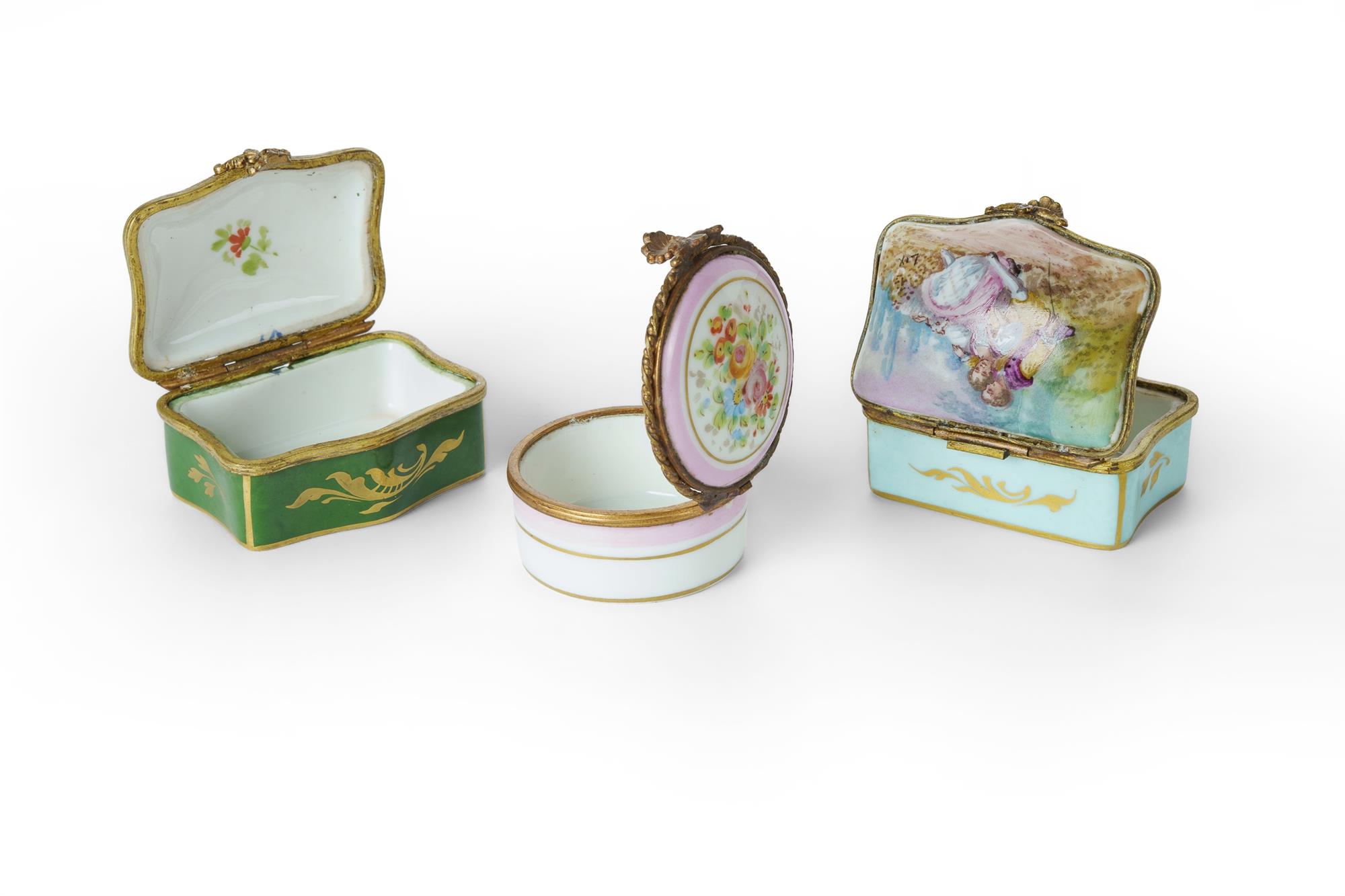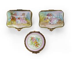 3 Early 20th C French Porcelain Pill Boxes Includes 2 sevres boxes with hand-painted hinged covers, signed 'Lix' (L5.5cm); and a limoges box with floral decorated lid (Dia.4.3cm)Estimate $40-80