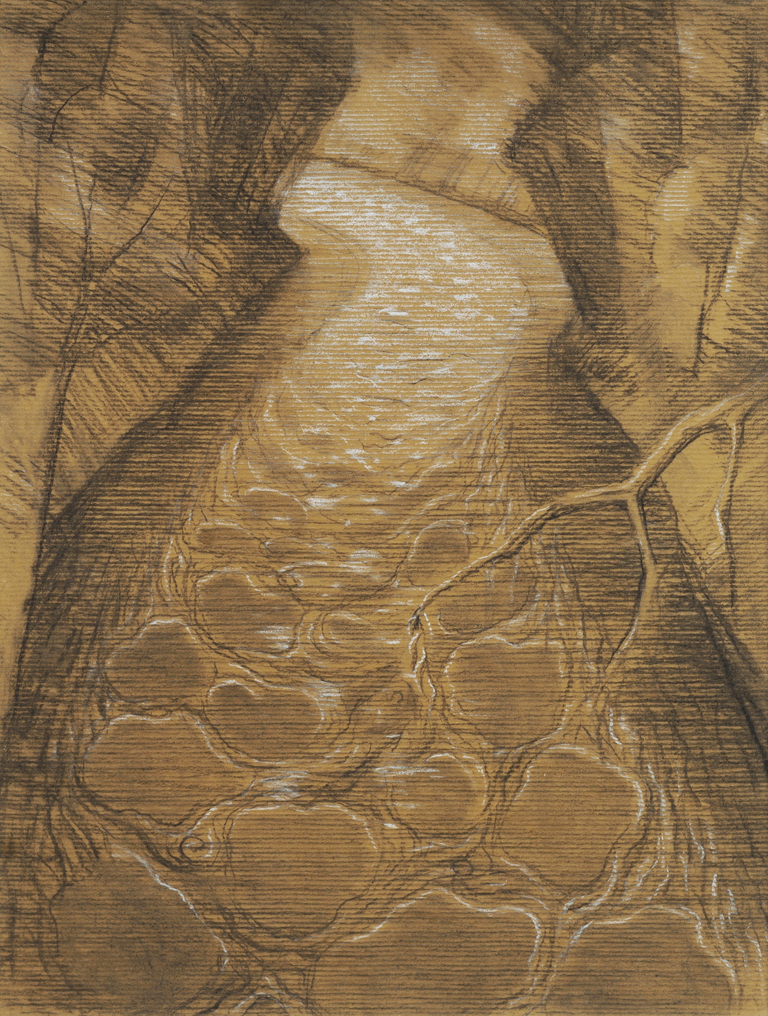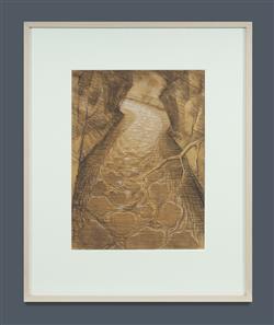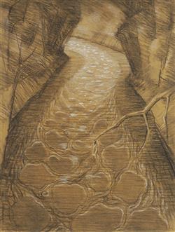 TAYLOR, Howard (1918-2001) 'Forest River,' 1990. No signature apparent. Ex Galerie Düsseldorf, WA (#HHT0146) Charcoal & Chalk on Brown Paper 45x33cm EXHIBITIONS: 'Howard Taylor - Paintings / Maquettes / Drawings', Galerie Düsseldorf, WA, 1st September - 6th October 2002 (label verso) OTHER NOTES: Related work: 'Forest River' 1990/3, oil painting, 122x92cm. Collection of National Gallery of Australia, Canberra (illus).Estimate $4,000-6,000