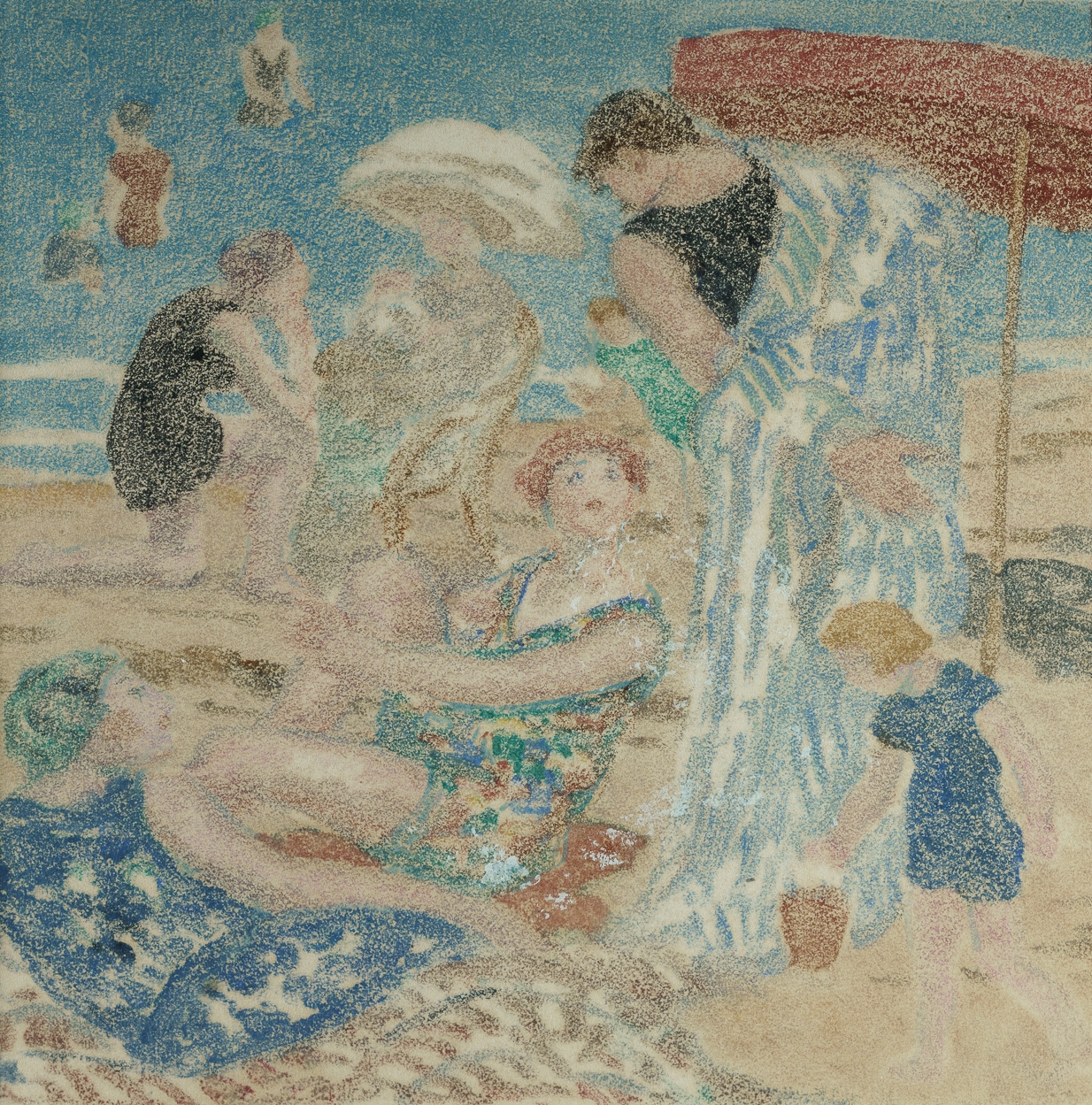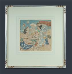 BUNNY, Rupert C W (1864-1947) 'Sur La Plage (On the Beach)' c.1920. Monogram upper left. Inscribed '65 Sur la Plage' verso (concealed by framing) Monotype 24.5x24.5cm