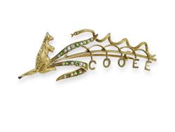15ct Pink Gold Colonial 'Cooee' Brooch Late 1880s to early 1890s "Cooee" brooch, featuring kangaroo and snake motifs. Set with 10 demantoid garnets (approx. 0.38ct total) and half pearls. Bears the mark of The Manufacturing Jewellers Association of Victoria, along with 15ct gold and a registered design mark. Dimensions approx. (6.4x2.2cm) and weighs approx. (6.3g)