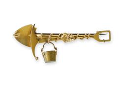 Pink Gold Goldfields Brooch Goldfields brooch featuring pick, shovel, bucket, rope, and gold nugget motif. Acid tested as approx. 15ct gold. Dimensions approx. (5.6x2.3cm) and weighs approx. (5.5g)Estimate $400-700