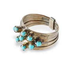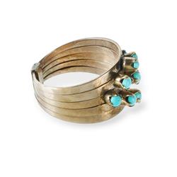 Blue Stone Dress Ring Handmade ring featuring 5 interlinked bands set with blue stones. Weight approx. 4.05g Estimate $20-40