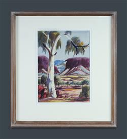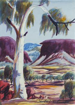 RABERABA, Herbert (1921-1980) Central Australian Landscape with Ghost Gum Signed lower right W/Clr 25x18cmEstimate $300-500