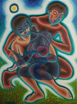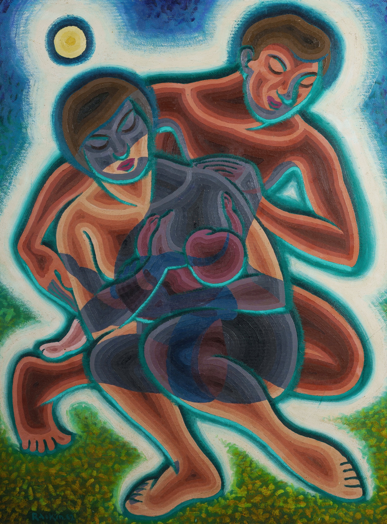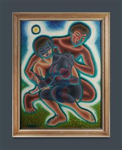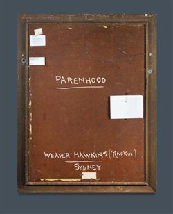HAWKINS, Harold Weaver (Raokin) (1893-1977) 'Parenthood,' 1962. Signed and dated lower left. Oil on Board 100x75cm PROVENANCE: The Fred and Elinor Wrobel Collection, Sydney; Estate Late Elinor Wrobel.Estimate $4,000-7,000
