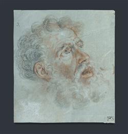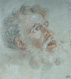 Attrib. Agostino MASUCCI Study for St Simon, the Apostle. The Day Collection (UK) stamp lower right and stamp verso. Various inscriptions including: 'Agostino Masucci / confirmed by Philip Pouncey / 24/2/81' and 'purchased in Florence by Robert Adam'. Black, Red & White Chalk 20x18cm (sheet)