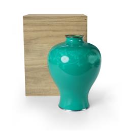 Japanese Ando Cloisonne Vase Green baluster form vase with band of lighter green floral decoration. In kiri wood (paulownia) 'tomobako' box. (H25cm)Estimate $150-300