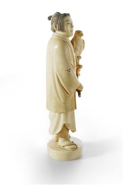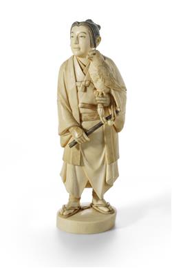 Japanese Showa Period Okimono Figure of a falconer, signed 'chikatoshi'. The falconer accurately depicted, wearing the traditional bandori falconer's coat. In kiri wood (paulownia) 'tomobako' box. (H23cm)Estimate $500-900