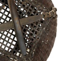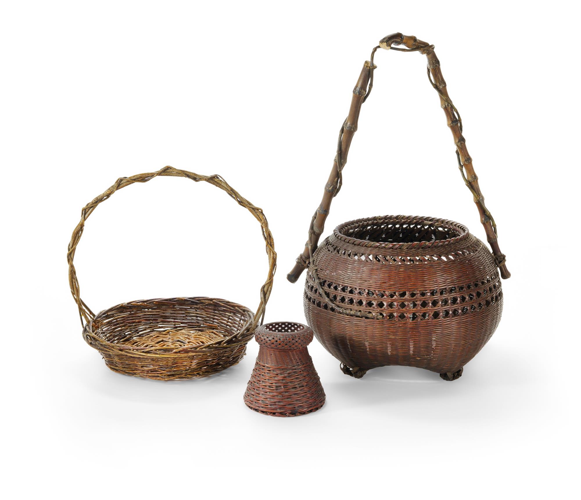 3 Japanese Woven Ikebana Basket Vases One with incised signature. H50cm (tallest)
