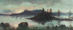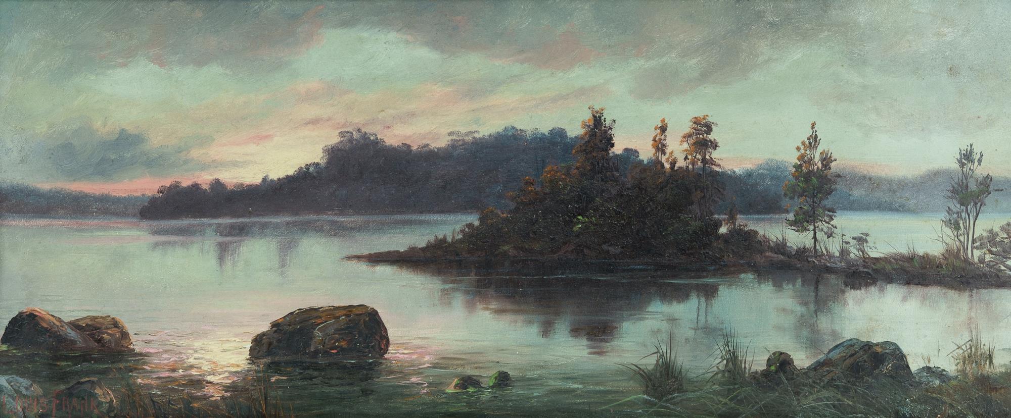 FRANK, Louis (c.1830-1923) Twilight on the River Signed lower left. Oil on Board 24.5x60cmEstimate $100-200